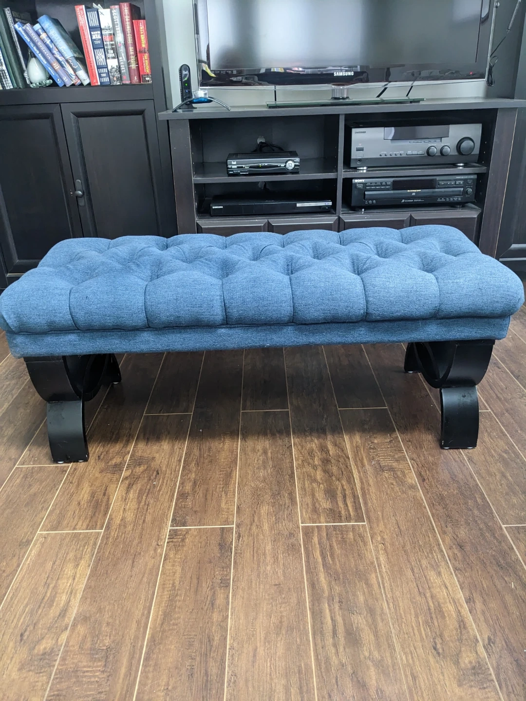 15Here's a lovely blue tufted ottoman bench, perfect for adding a touch of elegance to any room. The tufted design and stylish black legs make it a versatile piece that complements various decor styles. It's in great condition and ready to find a new home!