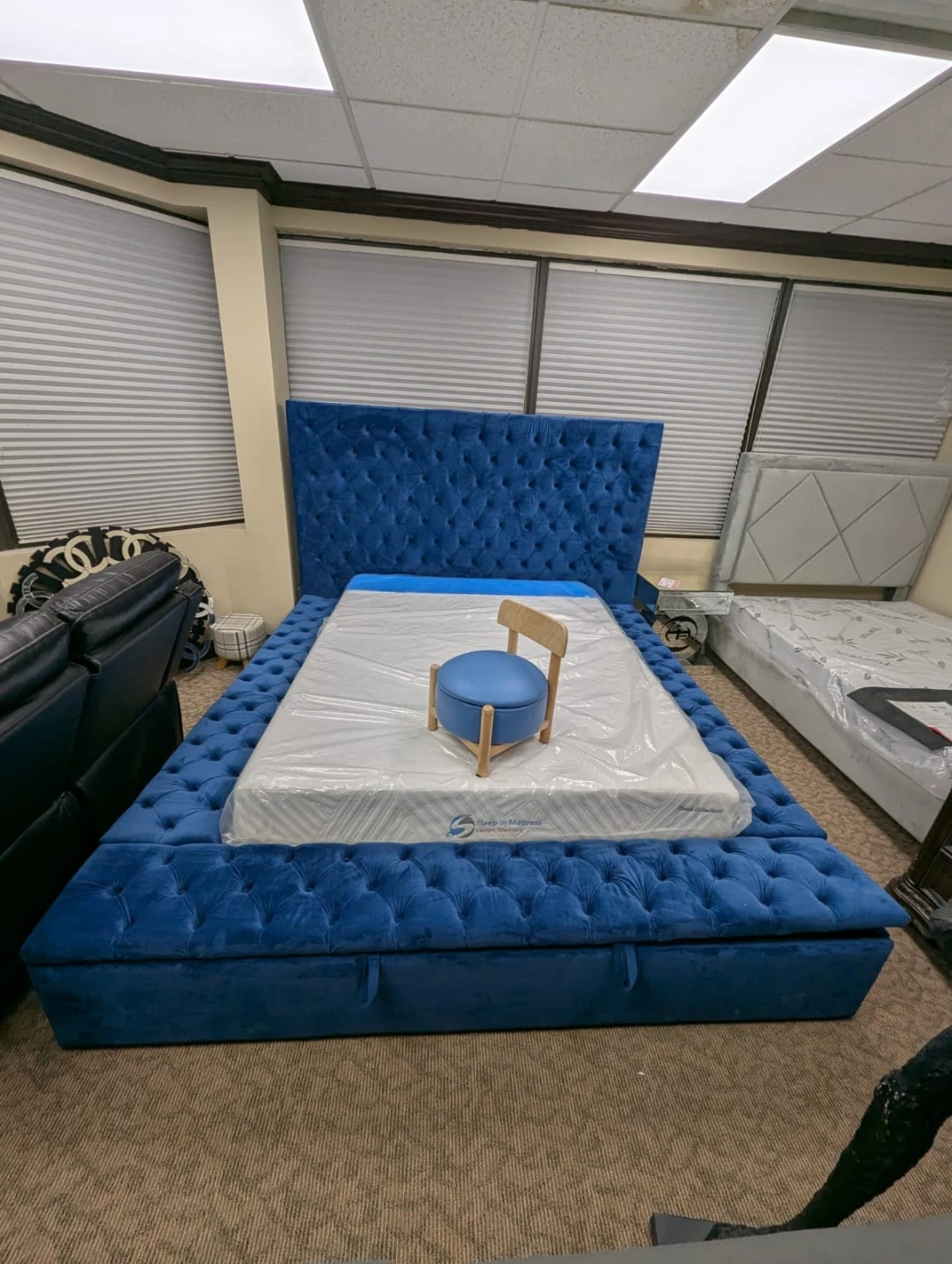 20Take a look at this stunning blue tufted upholstered platform bed! It features convenient storage underneath, perfect for keeping your bedroom tidy. The tufted headboard adds a touch of elegance to any space.