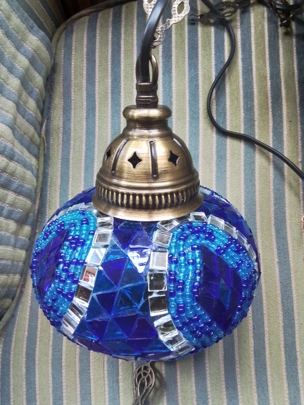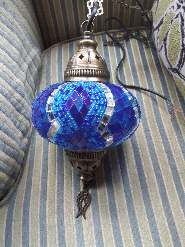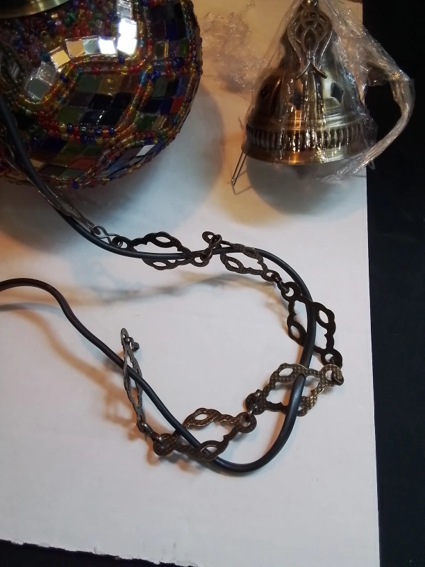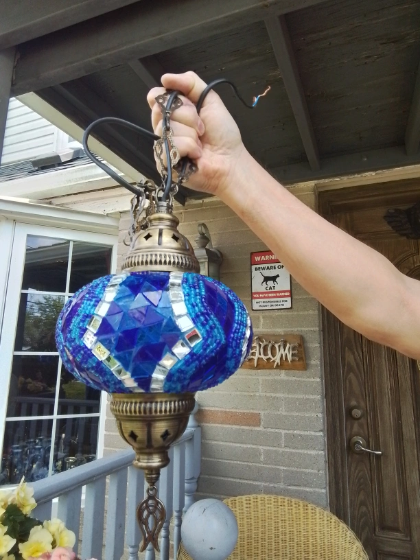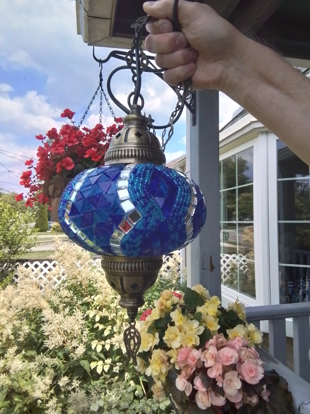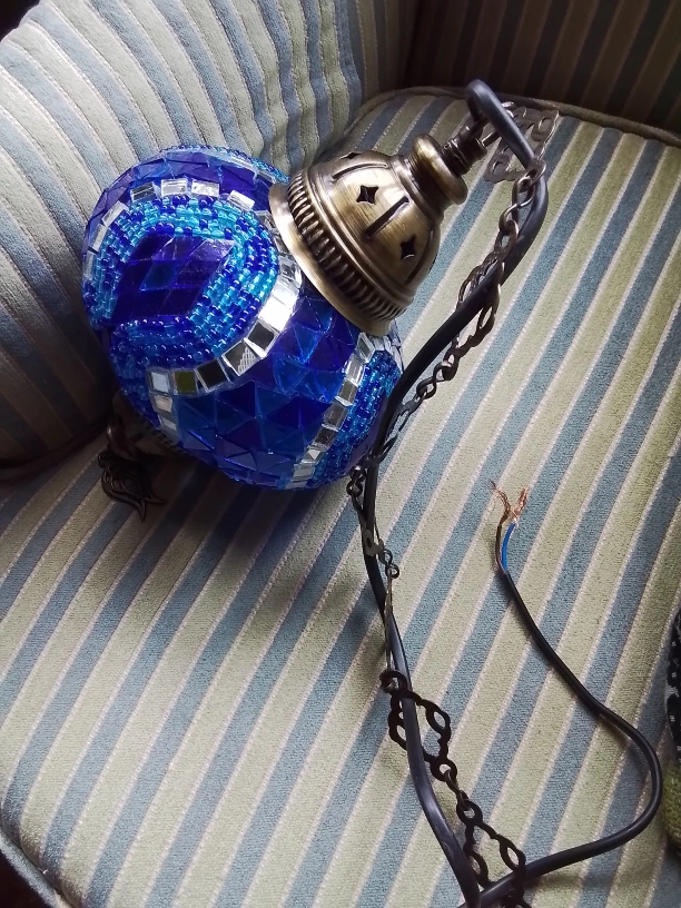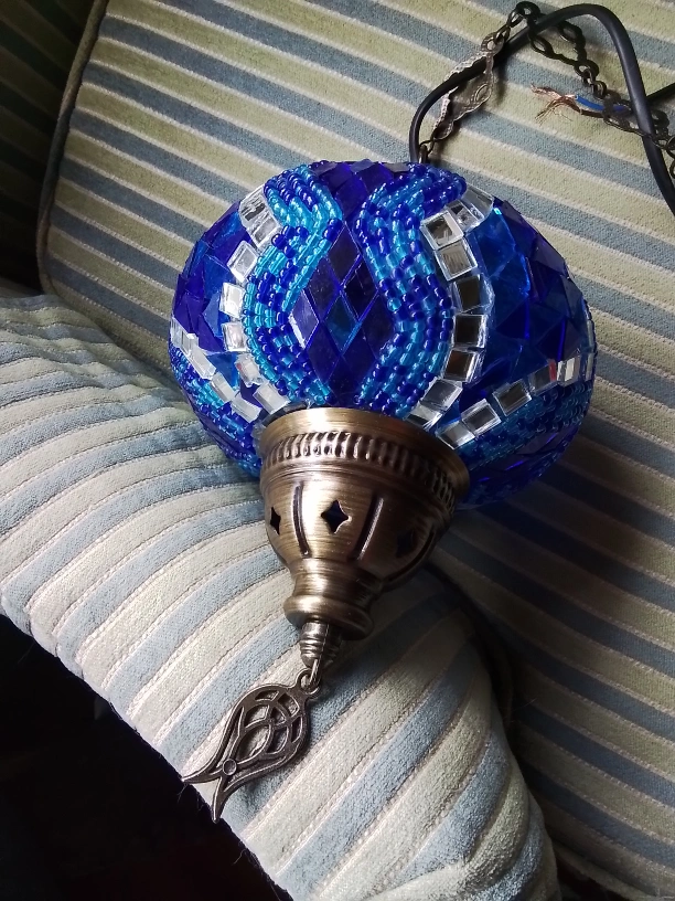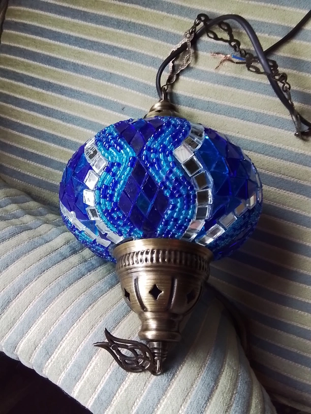 Blue Mosaic Turkish Hanging Lamp Selling a beautiful mosaic Turkish hanging lamp! It adds a lovely, colourful touch to any room. The intricate design and vibrant colours make it a unique piece This mosaic Turkish hanging lamp features a stunning blue and silver design, perfect for adding an exotic touch to any room. Being that the lamp is in new condition. It's a unique piece that casts beautiful, colorful patterns. Bulbs not included. See pictures for type of Bulbs to use. Here are some details: * Handcrafted mosaic glass * Intricate metal detailing * Globular Body * Hanging chain included Measurements approximately 6 x 13 Looking to add a conversation piece to your living room? This lamp is it! But remember, while the magic of the lamp is real, availability is not guaranteed. If you're reading this, it's still up for grabs! Yonge Street and Steeles Avenue