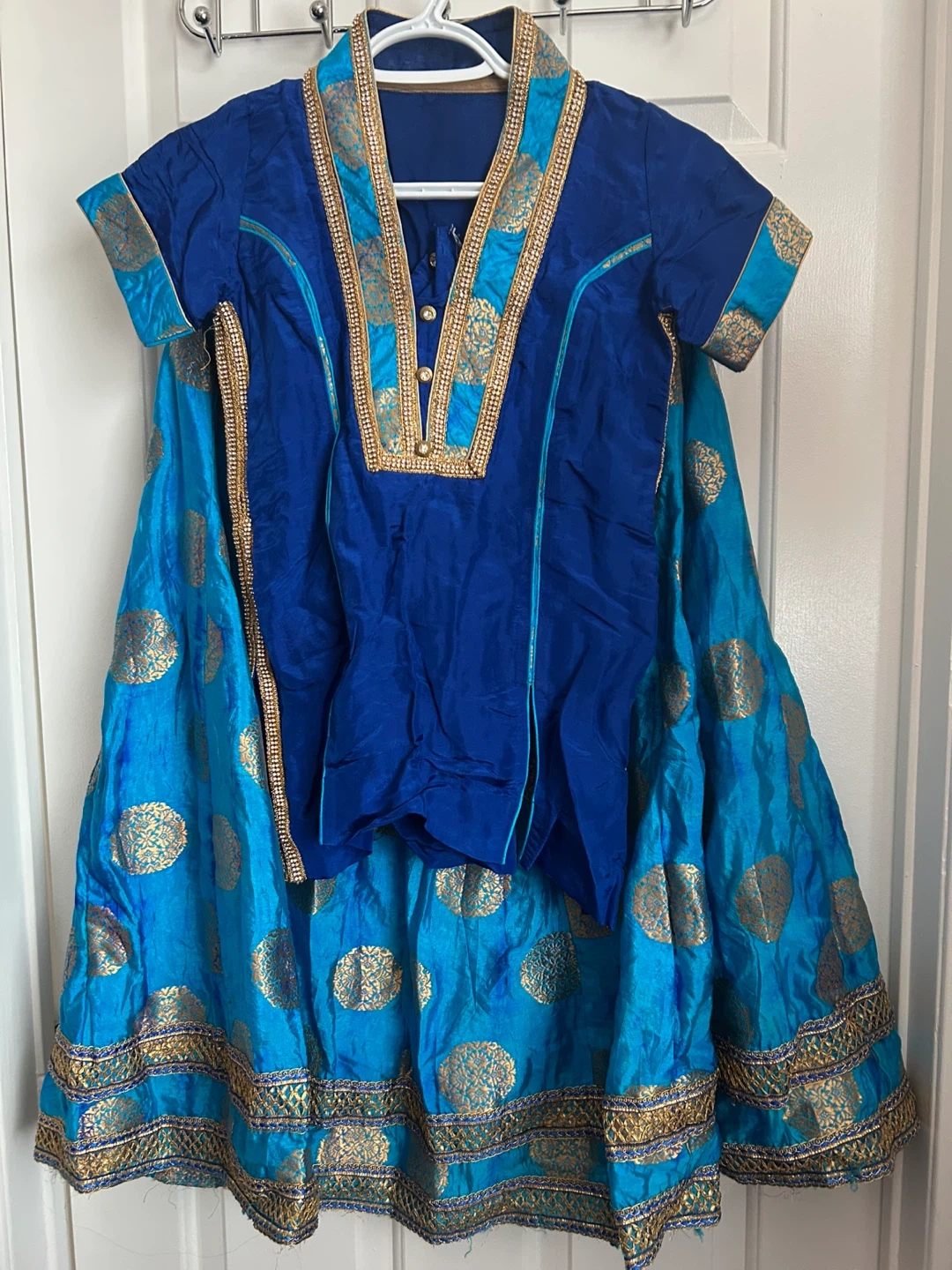 11Beautiful blue and turquoise lengha with gold detailing. Perfect for a special occasion! The top is a darker blue and the skirt is a lighter turquoise with gold accents