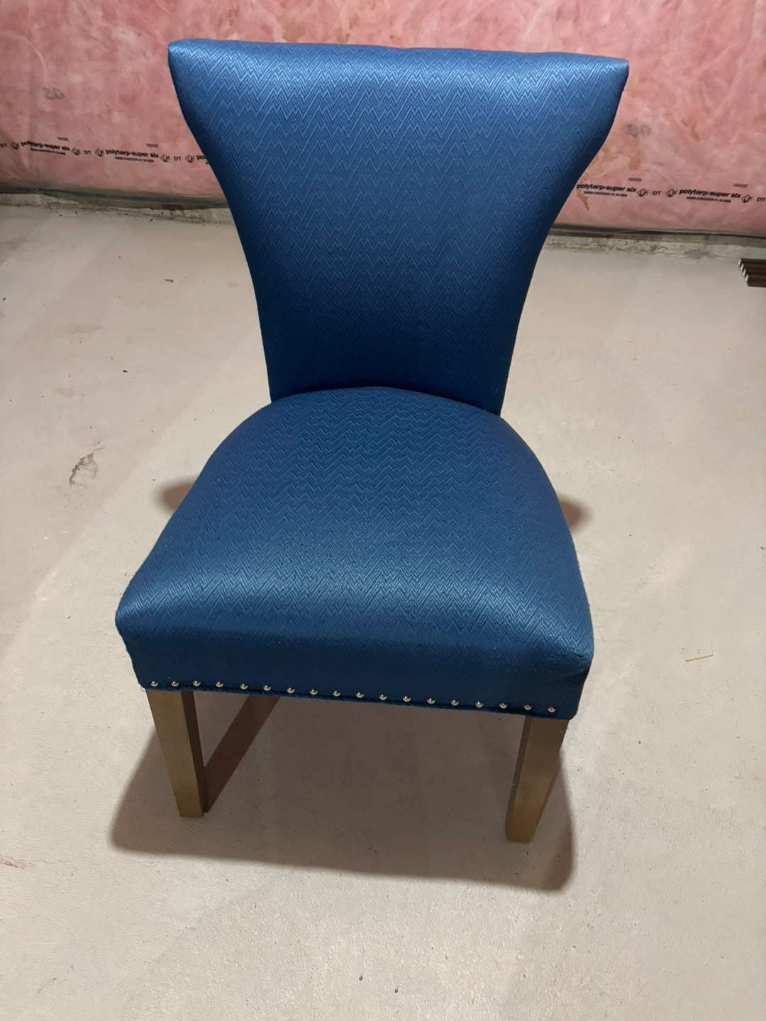 10Selling a lovely blue upholstered dining chair! It's in great condition and would look fantastic in any dining room or as an accent chair. The upholstery is a nice textured fabric, and it has decorative nailhead trim. Perfect for adding a touch of elegance to your home