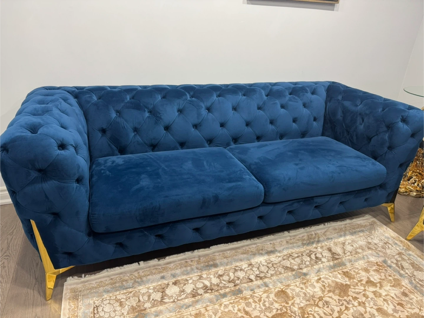 Selling a beautiful blue velvet sofa with a Chesterfield style design! It features a tufted back and gold coloured legs. It's in great condition and would look lovely in any living room or seating area