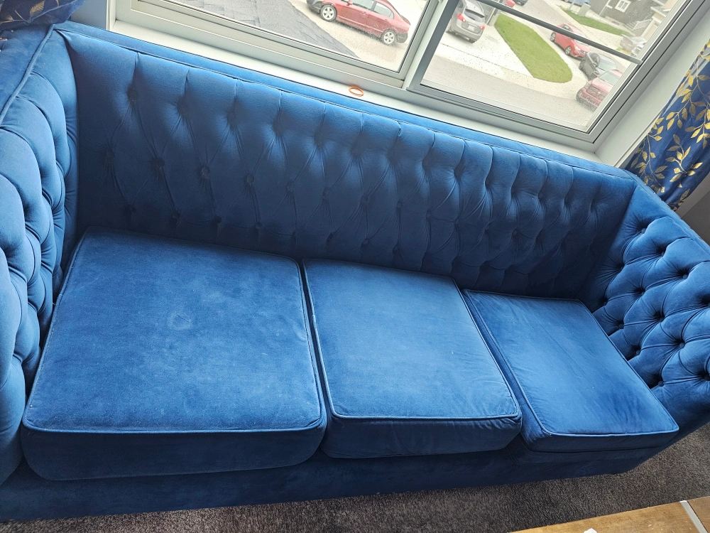 Selling a lovely blue velvet sofa in a Chesterfield style! It's a beautiful piece that would look great in any living room or den. The velvet is soft and the cushions are comfortable. There are some signs of use on the cushions.