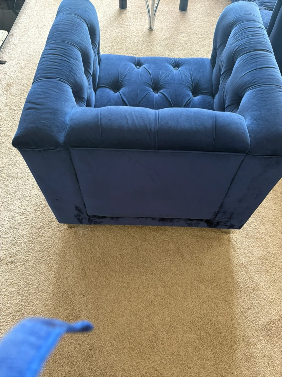 Selling a lovely blue velvet accent chair! It features button tufting and nailhead trim, giving it a stylish and elegant look. Perfect for adding a pop of colour and comfort to any room in your home