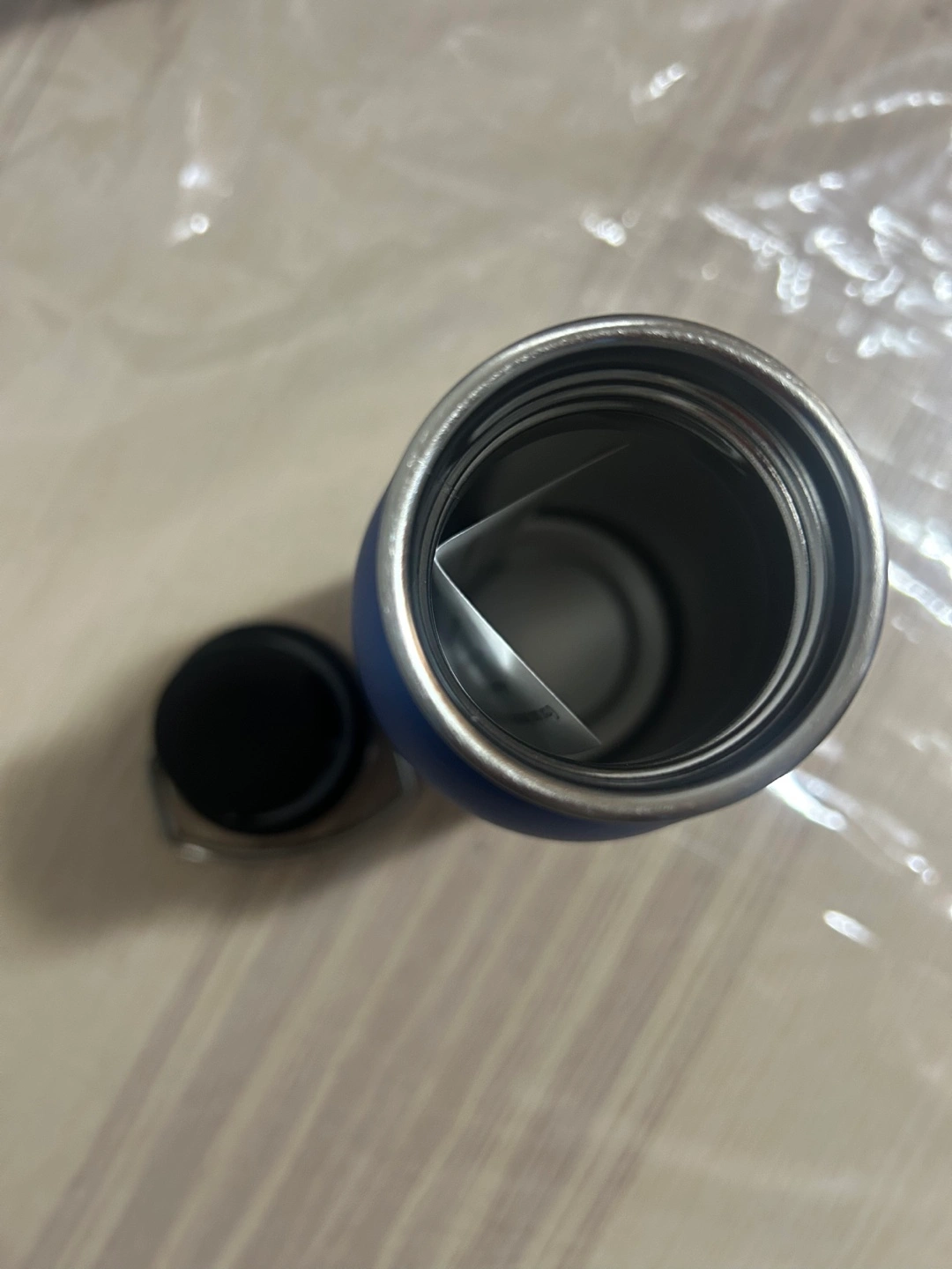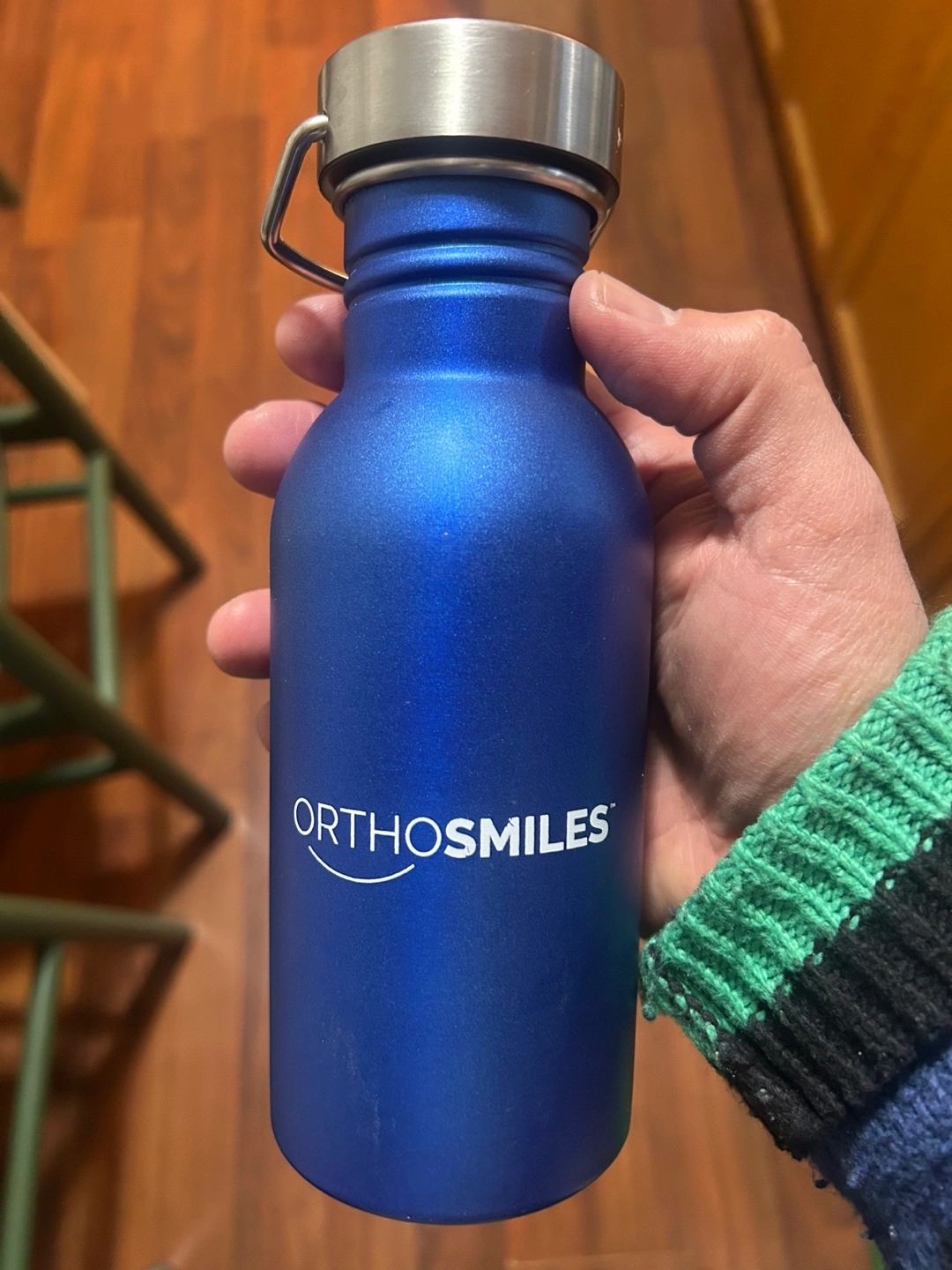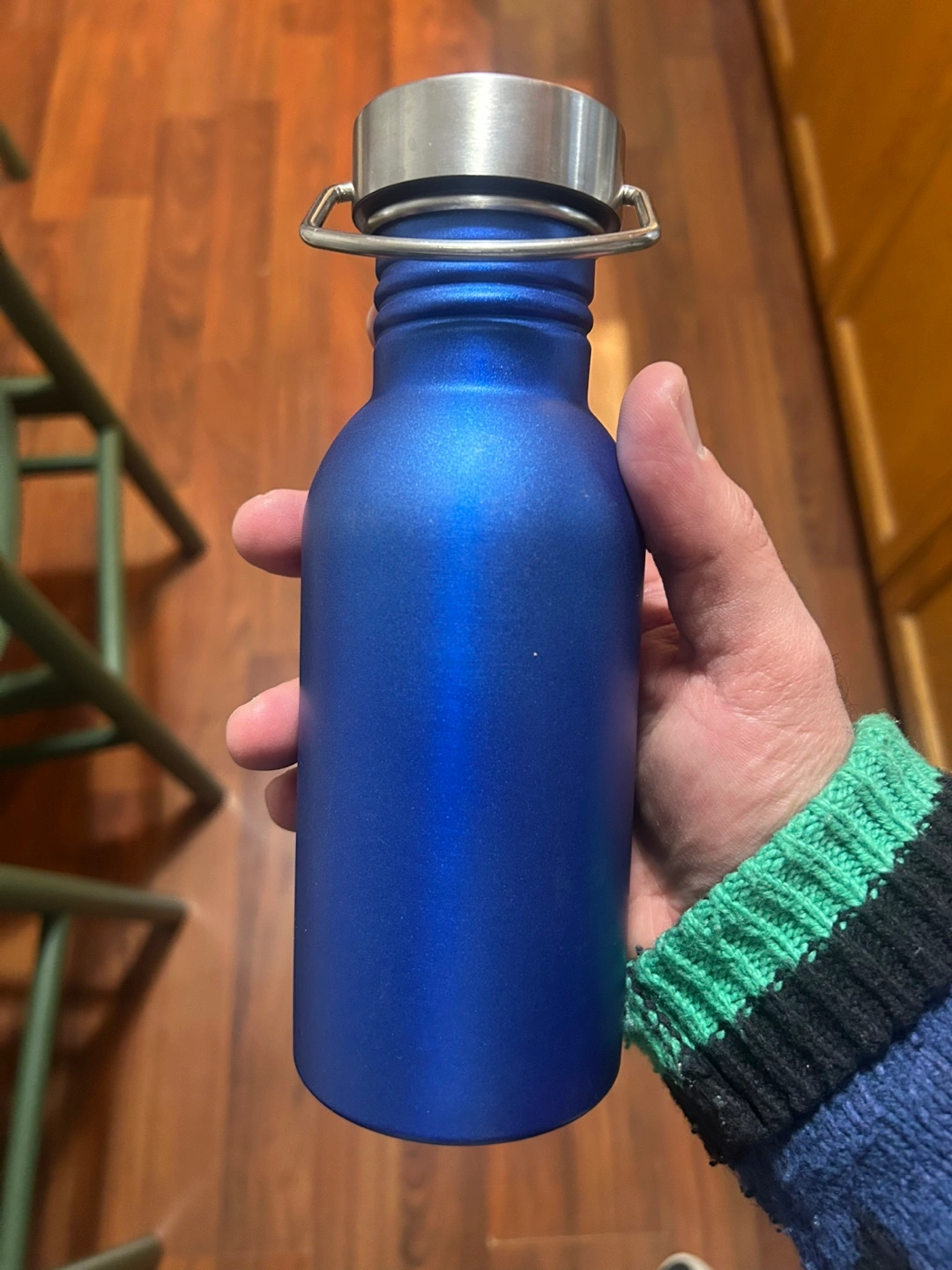 Reusable water bottle. Blue colour. Small size. Metal. Screw-on lid with carrying loop. Branding visible.