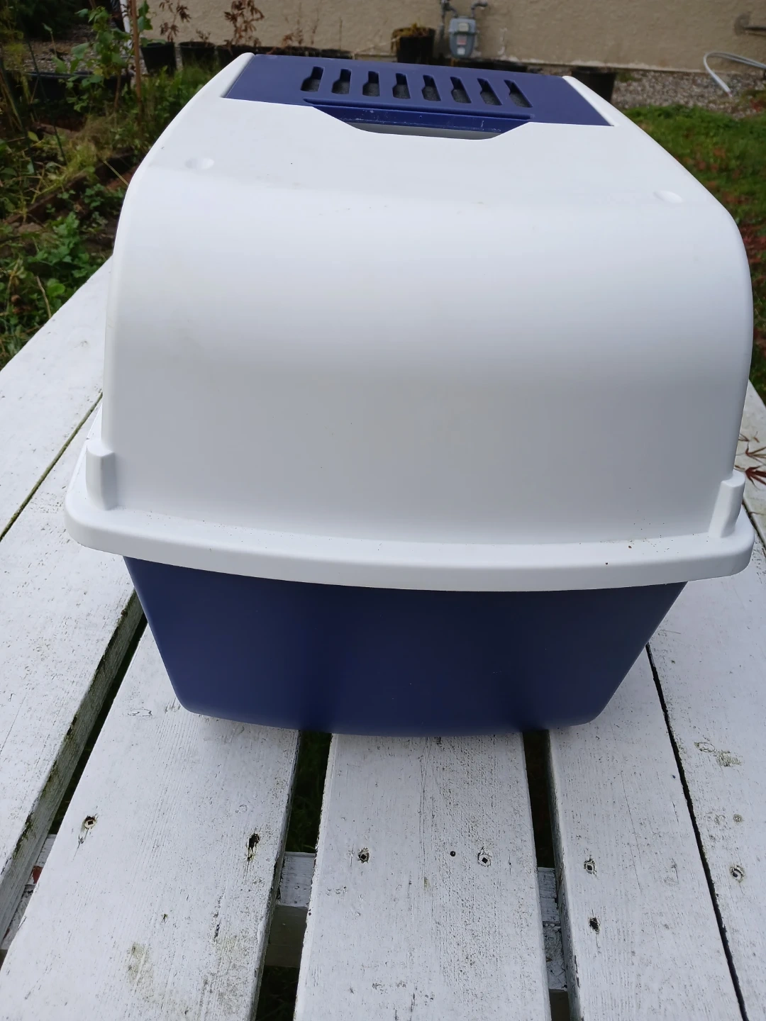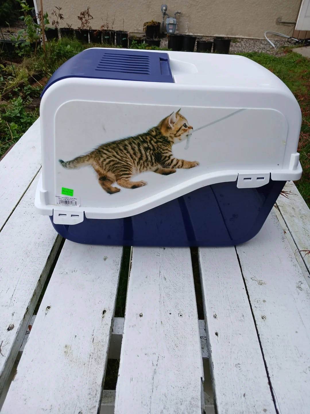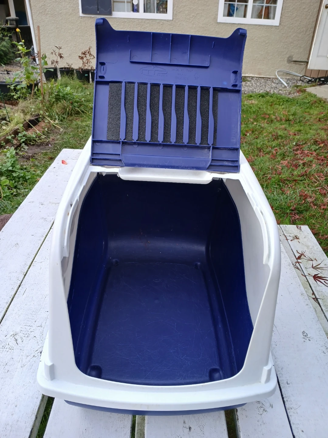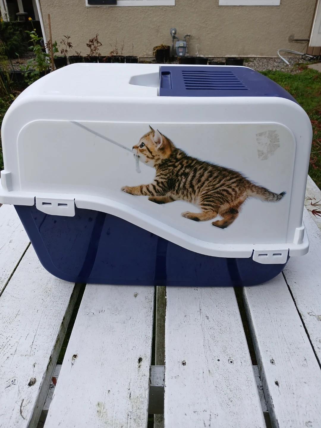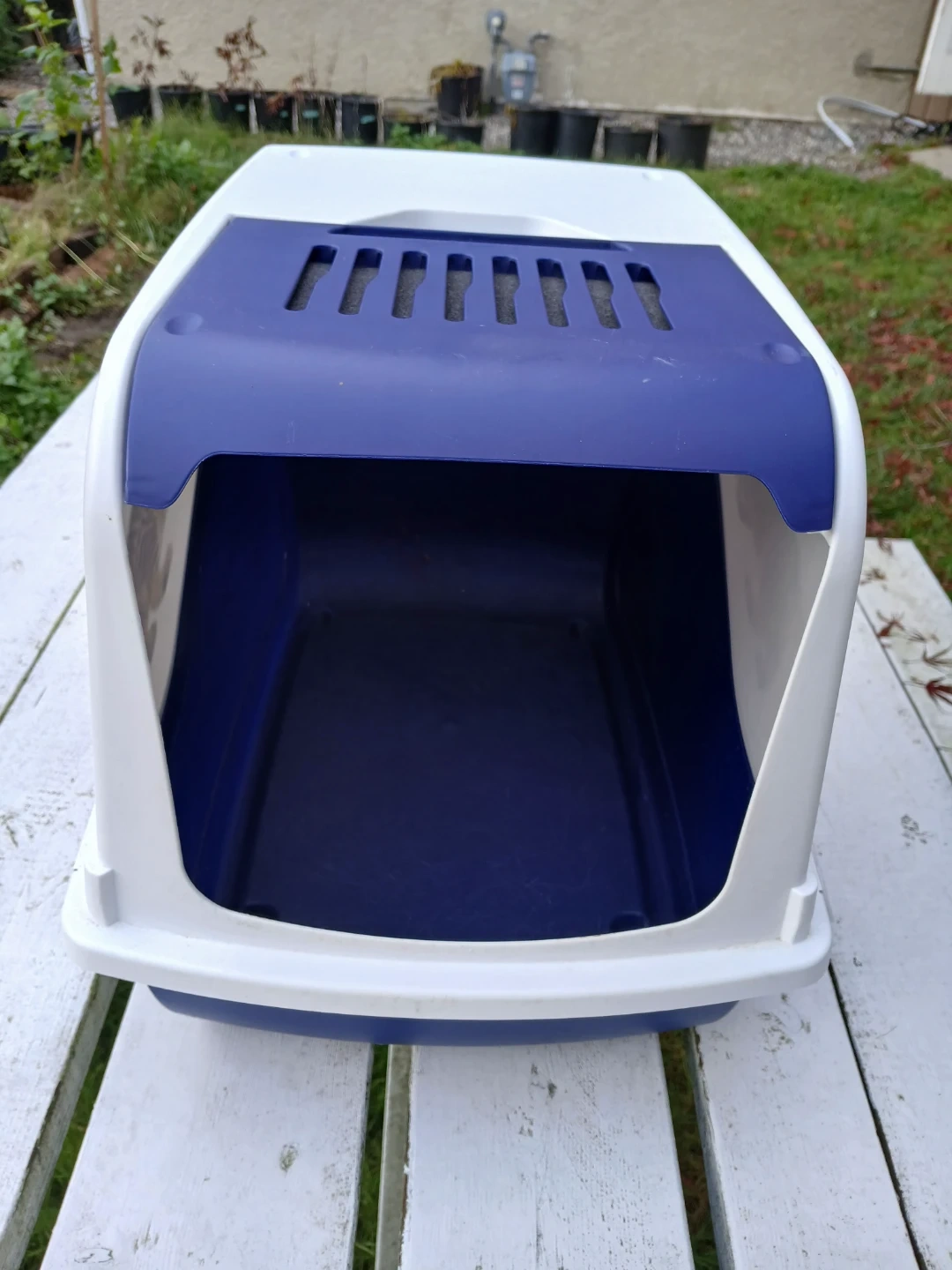 10Selling a covered cat litter box in good condition! It's a mix of blue and white, and the cover helps keep things tidy and discreet. The box is spacious enough for most cats and easy to clean. Great for keeping odours contained. 13x20, 14" tall