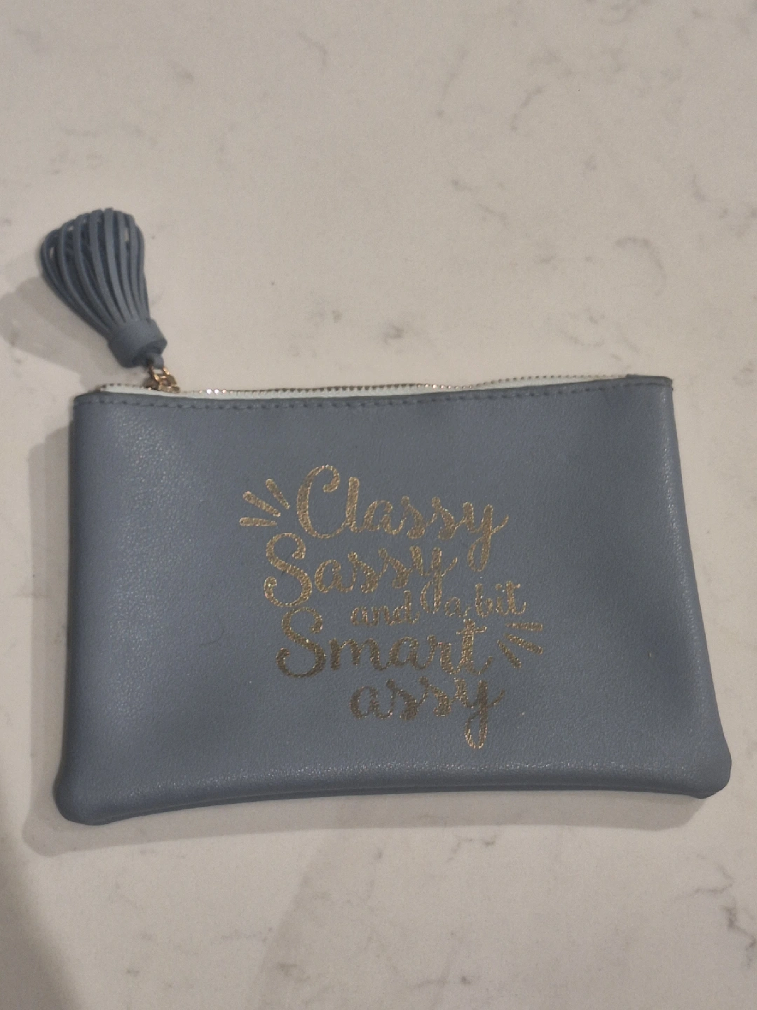 A cute zippered pouch in a lovely blue colour! It features a tassel and the words "Classy Sassy and a bit Smart Assy" in gold lettering. Perfect for holding small items!