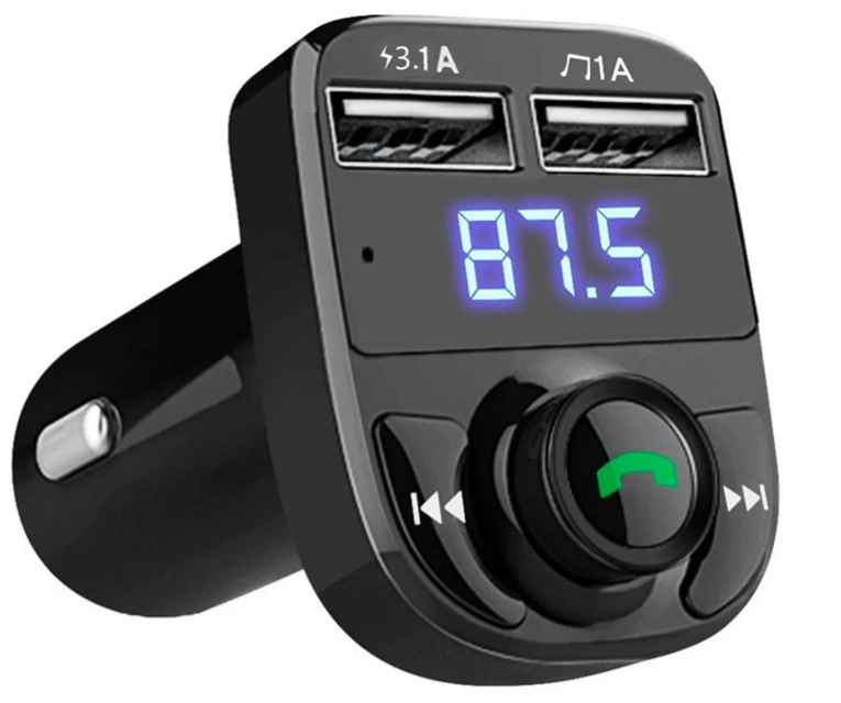 60This is a Bluetooth FM transmitter and car charger. It has two USB ports, each with 3.1A output. The display shows 87.5 FM frequency. It also has call and music controls