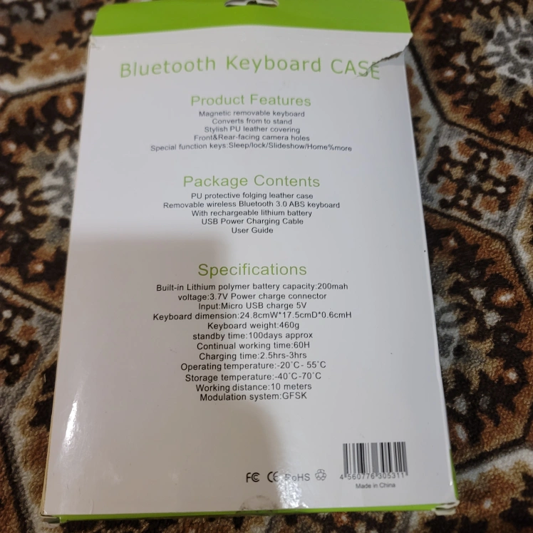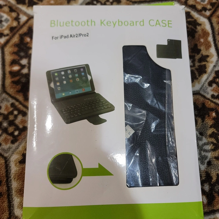 New Bluetooth keyboard case. Compatible with iPad Air 2 and iPad Pro 2. Features a removable keyboard, stylish PU leather covering, and protective case. Includes front and rear facing camera holes. Special function keys. Rechargeable lithium battery.
