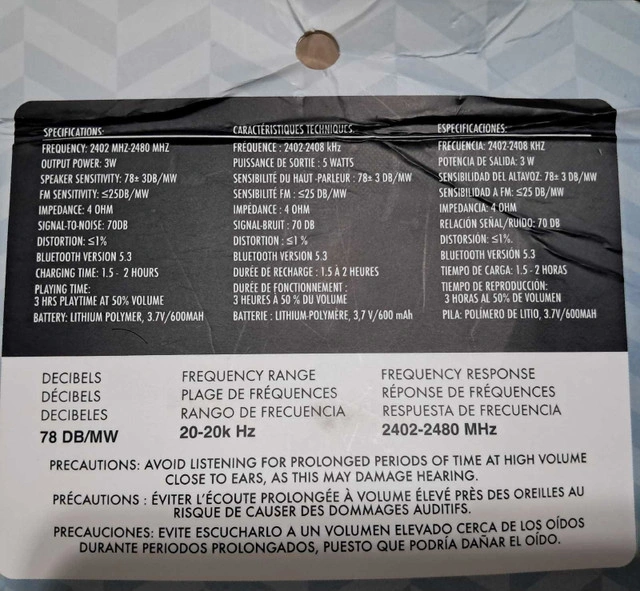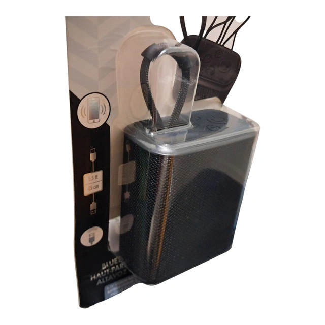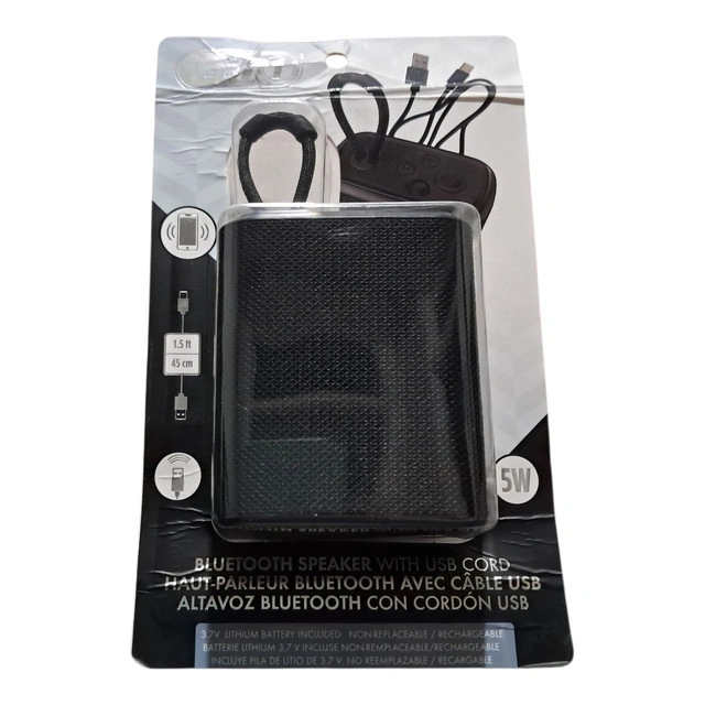 104Listen to your favourite tunes with this compact, black Bluetooth speaker, equipped with a USB cable and measuring approximately 1.5 feet in length. New in packaging, this speaker features a 3.7V lithium battery, 5W output, and Bluetooth version 5.3 for clear, wireless audio. Additional specifications: * Frequency: 2402-2480 MHz * Output Power: 3W * Speaker Sensitivity: 78+3dB/mW * FM Sensitivity: ≤25dB/mW * Impedance: 4 Ohm * Signal-to-Noise: 70dB * Distortion: ≤1% * Bluetooth Version: 5.3 * Charging Time: 1.5-2 Hours * Playing Time: 3 Hours at 50% Volume * Battery: Lithium Polymer, 3.7V/600mAh