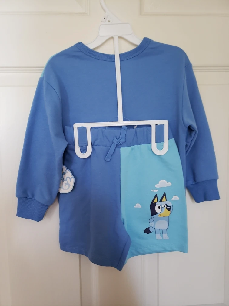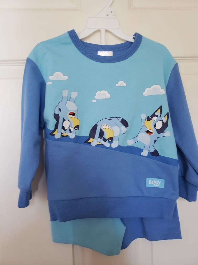 Super cute Bluey themed outfit for kids! The set includes a long-sleeved top and shorts, perfect for your little one. The material is 65% polyester and 35% cotton, making it comfy and easy to care for. Size is 3T