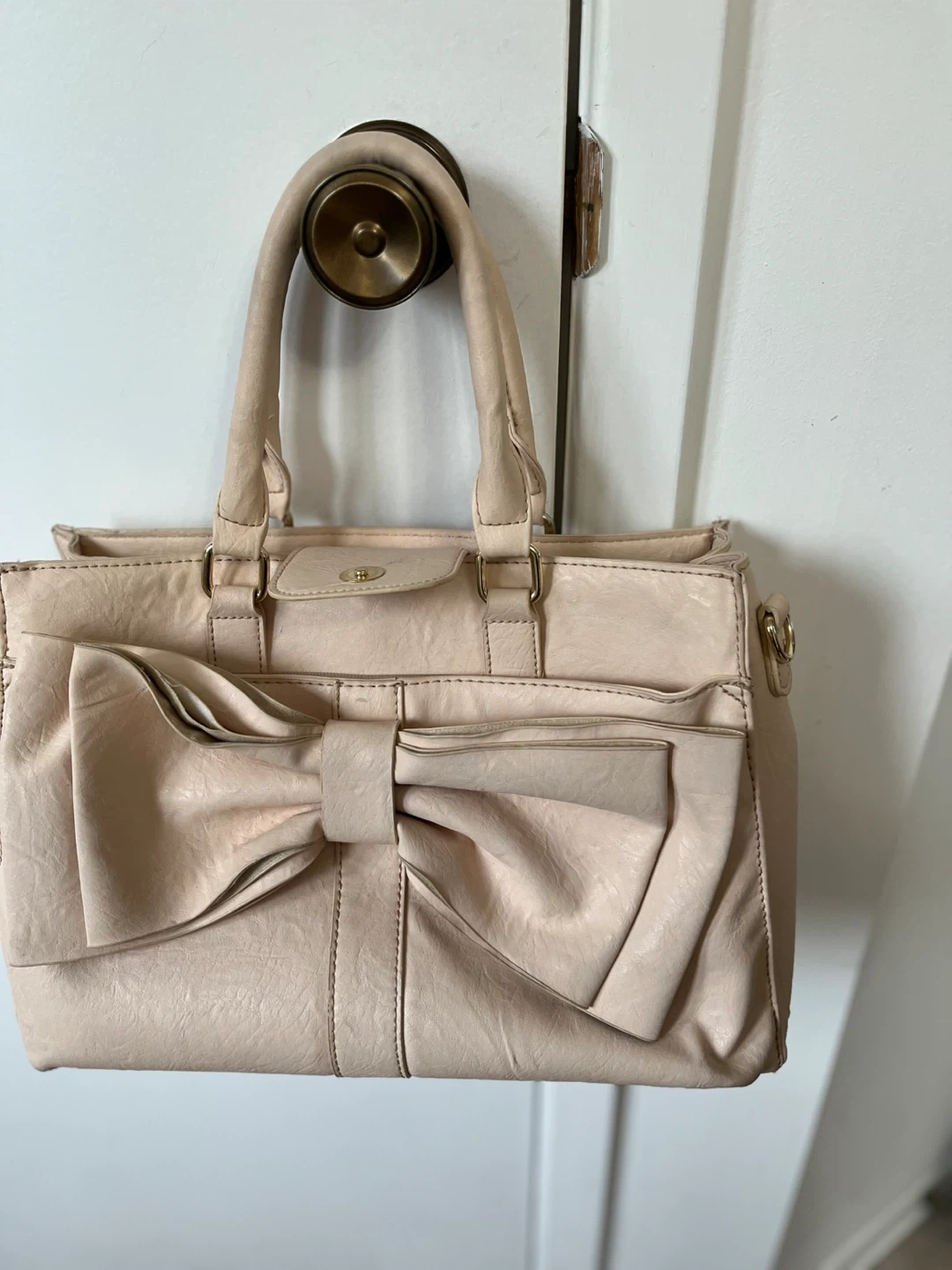 307A cute blush pink handbag with a bow detail! It's in great condition and perfect for everyday use or a special occasion. It has a magnetic closure and several compartments inside to keep your belongings organized Location for pickup INTERSECTION OF KENNEDY DENISON ONE BLOCK NORTH OF STEELES CLOSE TO PACIFIC MALL