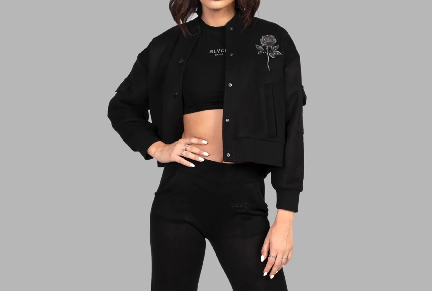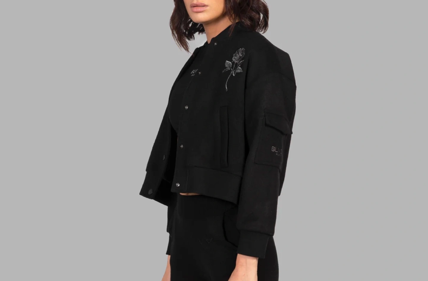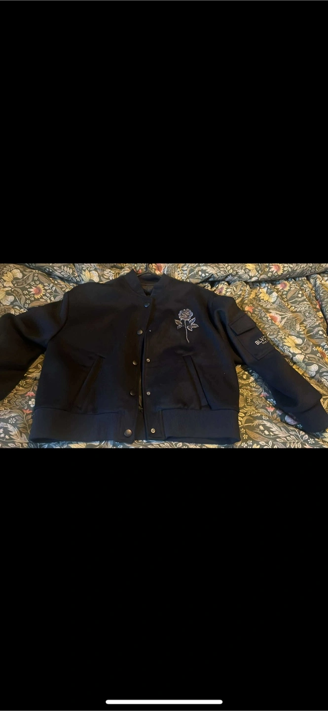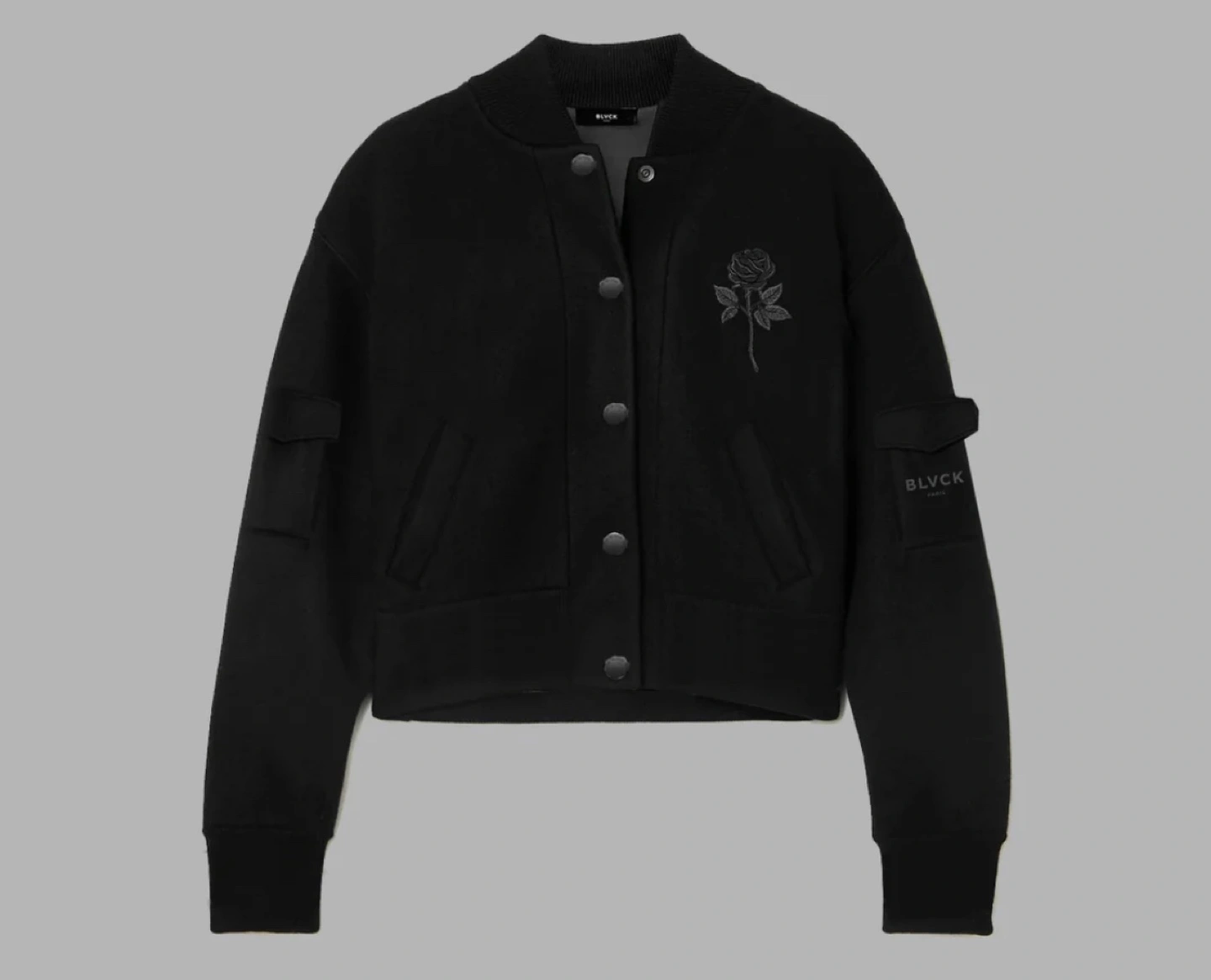 51Black bomber jacket with a rose embroidered on the chest and BLVCK Paris logo on the sleeve. Snap button closure.
