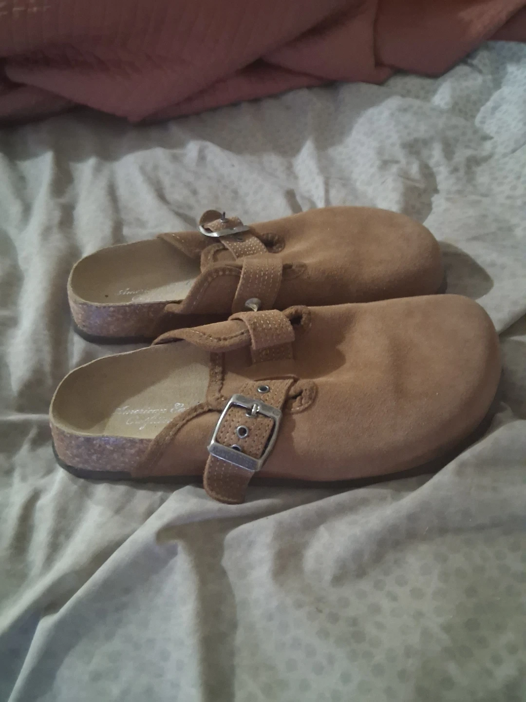 These are a pair of American Eagle Outfitters clogs in a brown suede material. They feature an adjustable buckle strap and a comfortable footbed. These are perfect for casual wear!