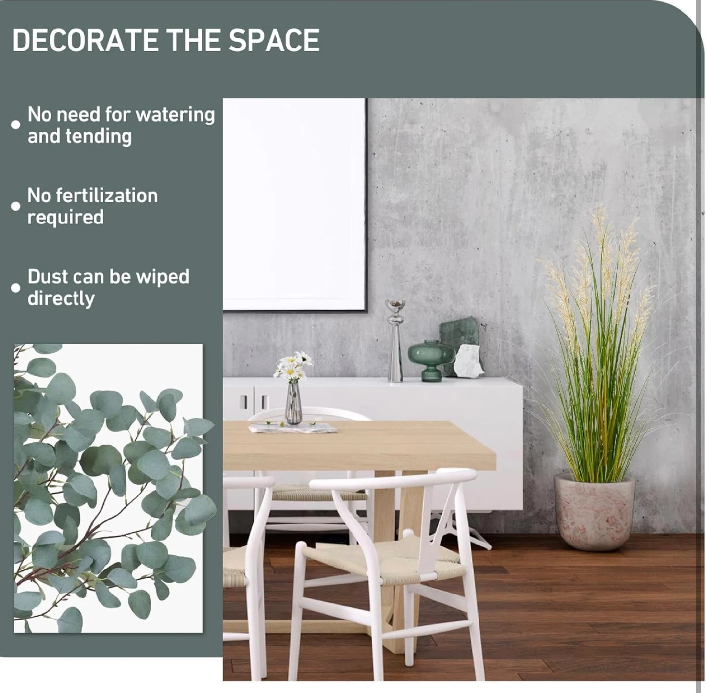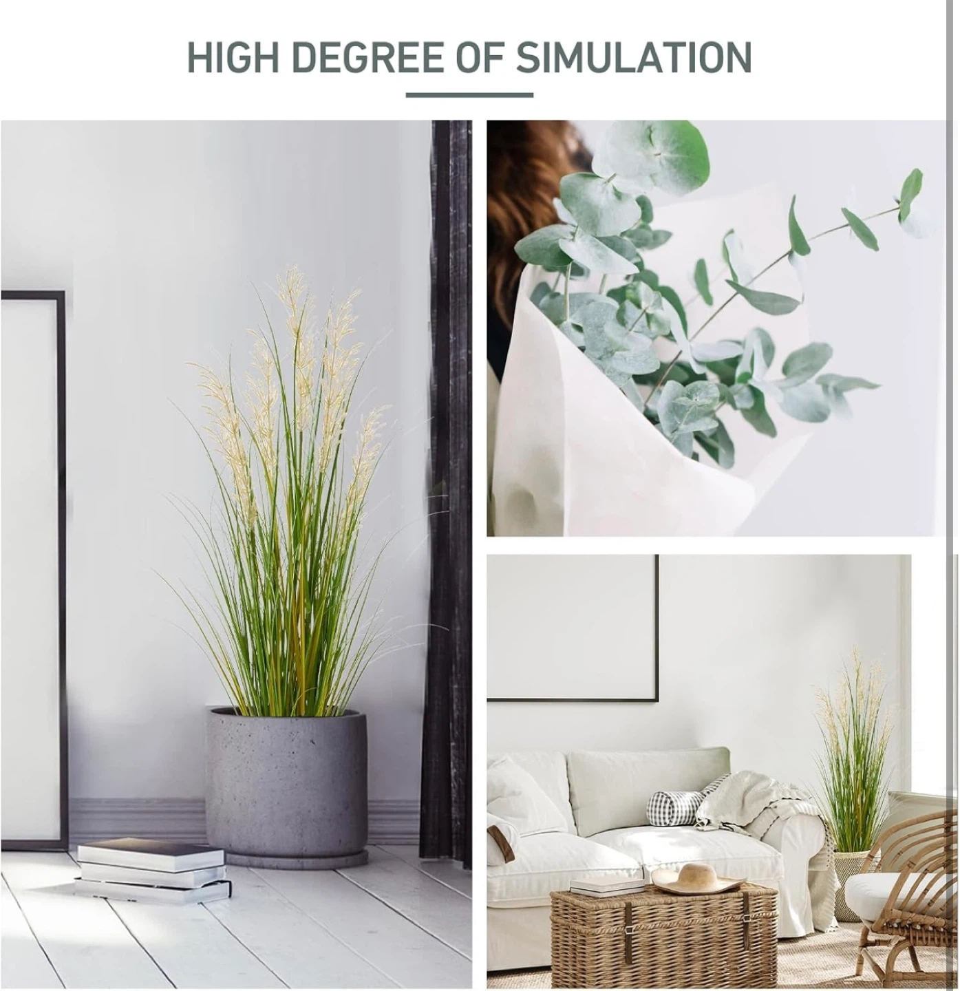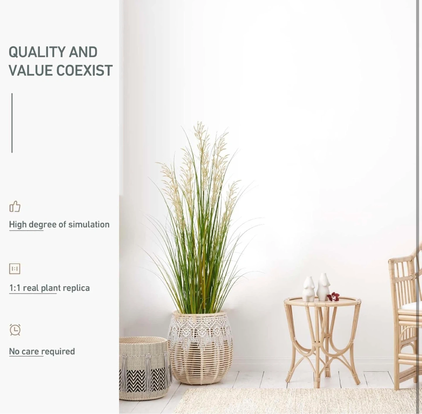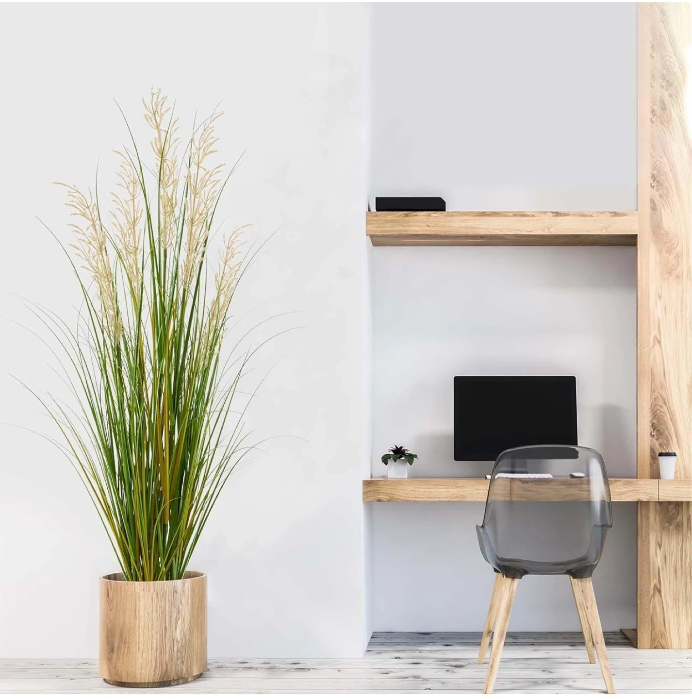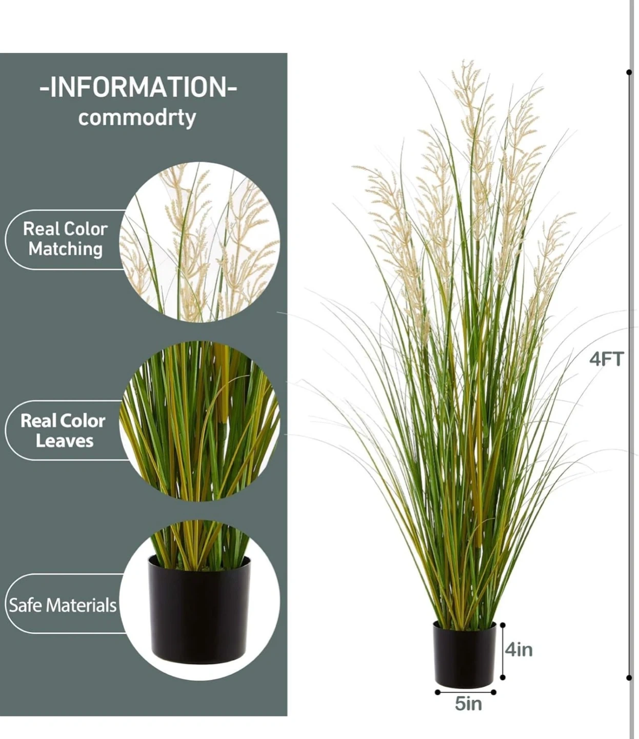 This 4ft tall artificial grass plant comes in a black pot. It's a realistic replica with no care required. The plant's pot measures 5 inches in diameter and 4 inches in height. It's made with safe materials.