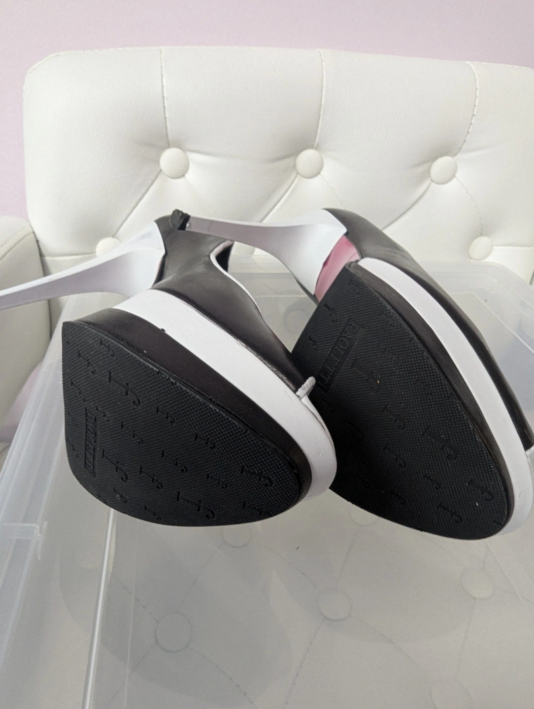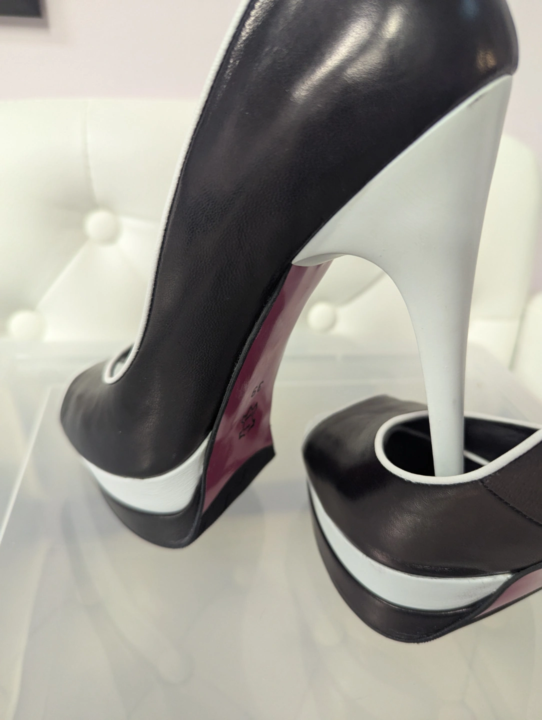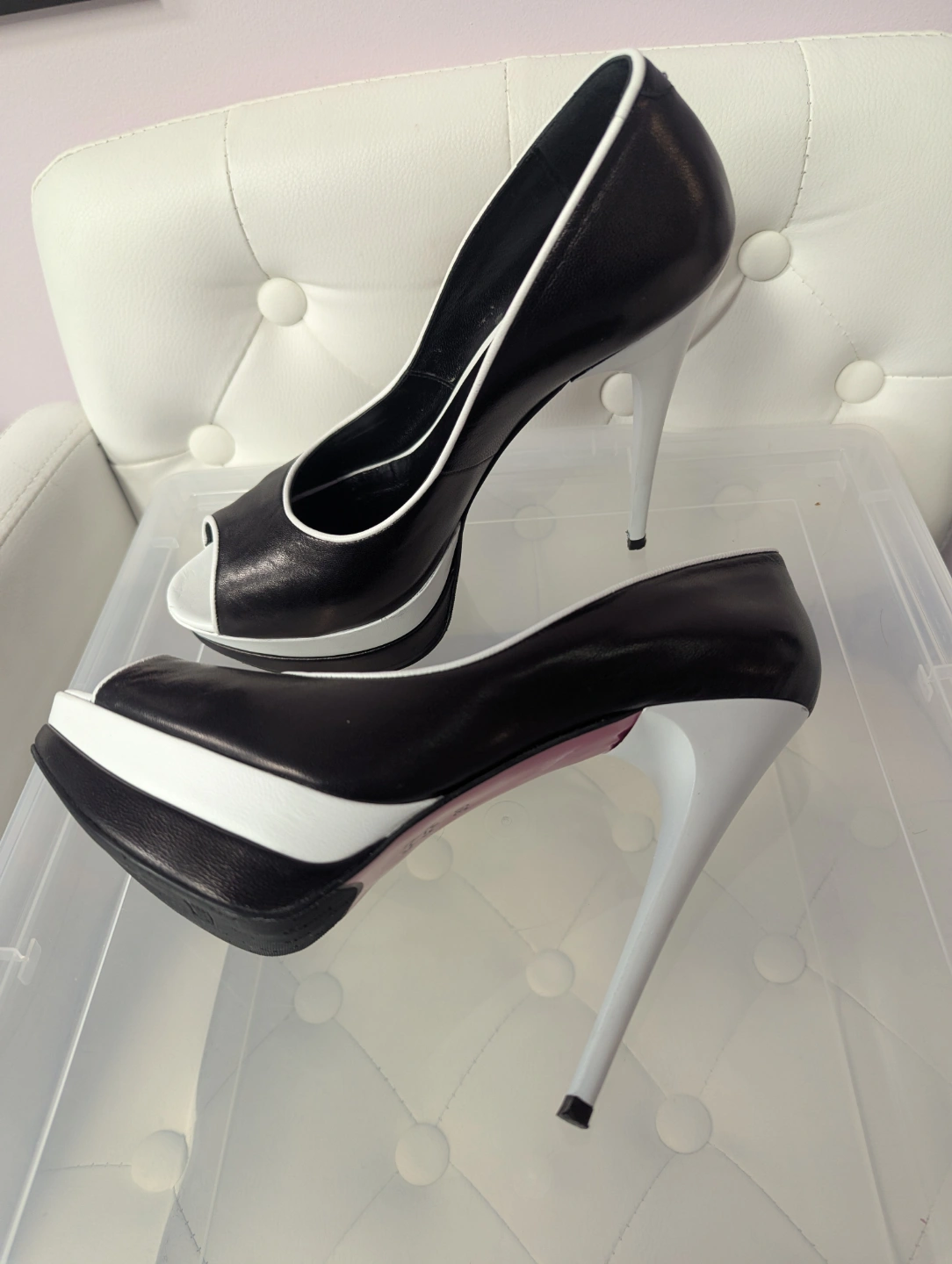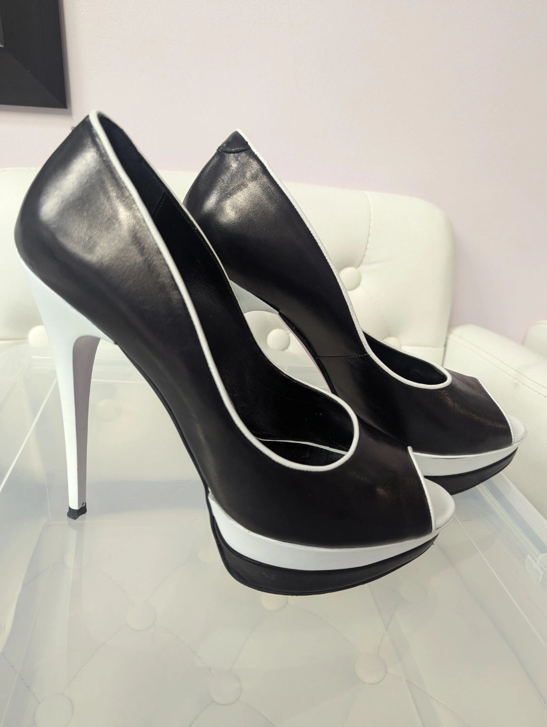 Stunning dark brown π€ and white leather peep-toe platform heels. High stiletto heels. Size 39. Stylish and elegant.