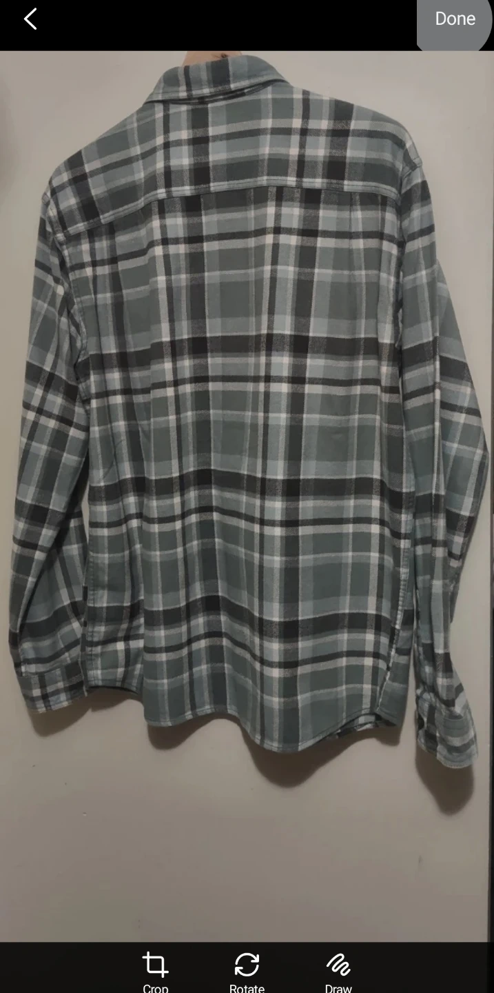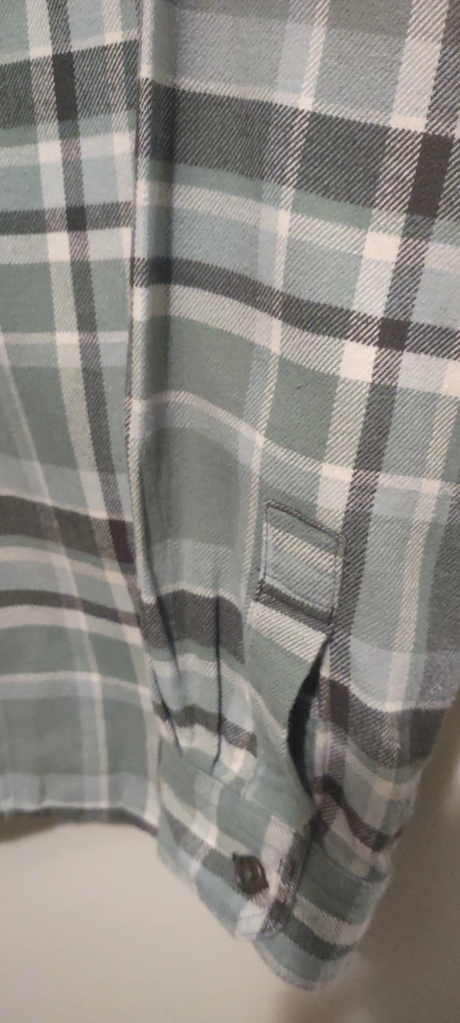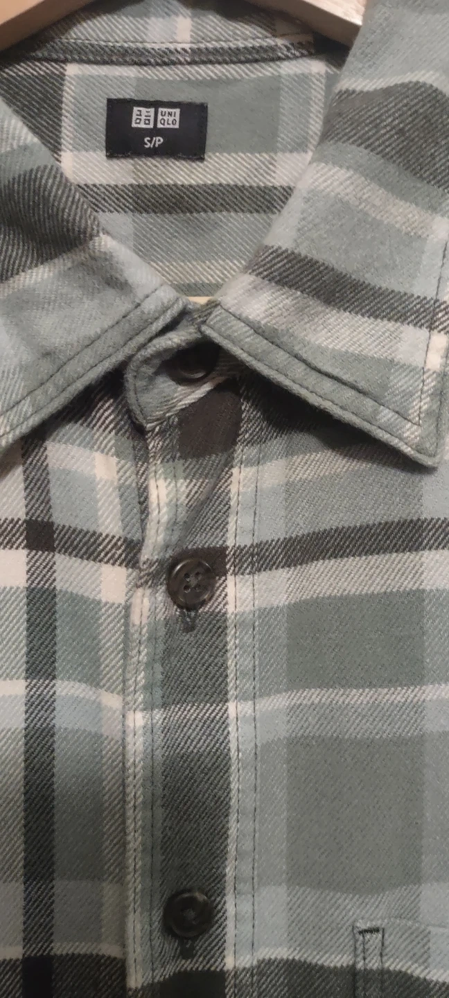 Here's a gently used Uniqlo flannel shirt. It's a size small with a classic plaid pattern in shades of grey, white, and light blue. Perfect for layering or wearing on its own!