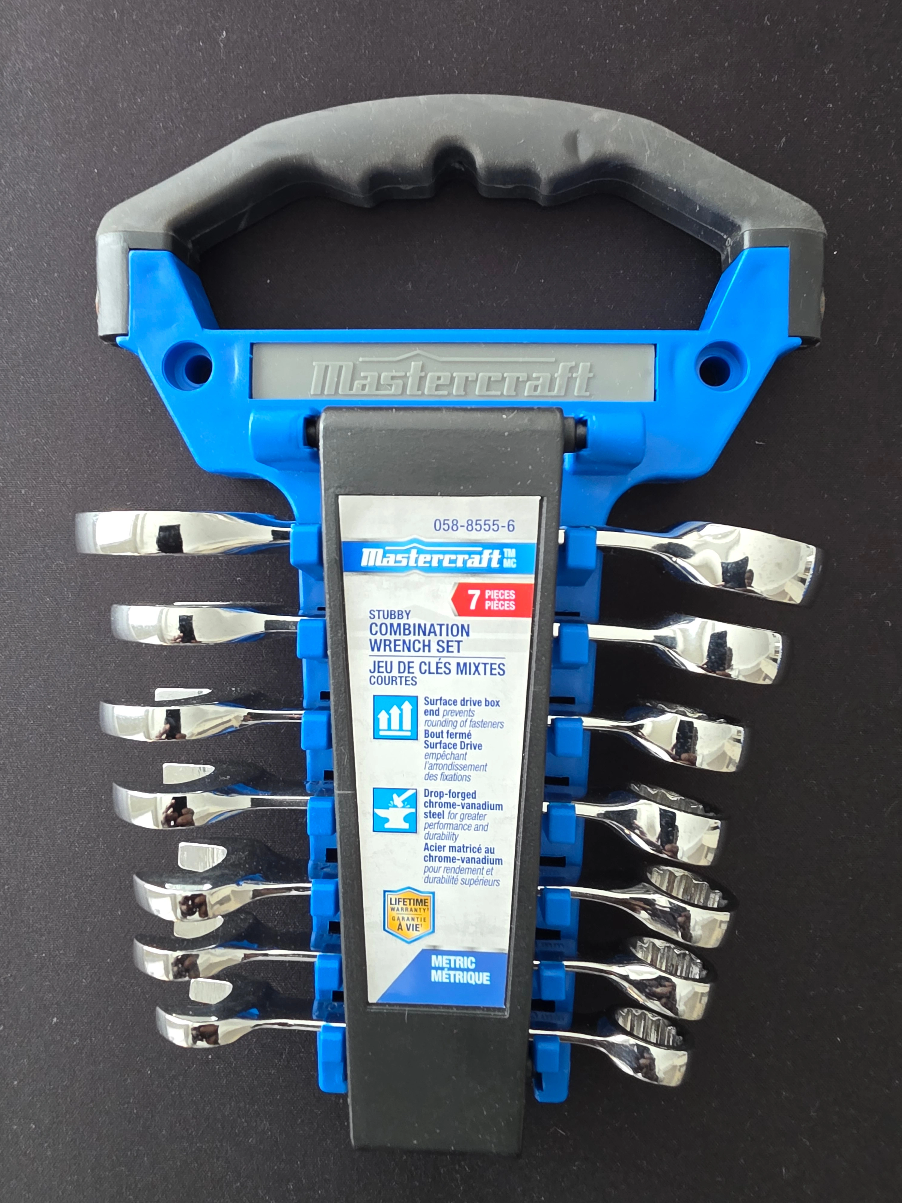 Mastercraft 7‑piece metric stubby combination wrench set.