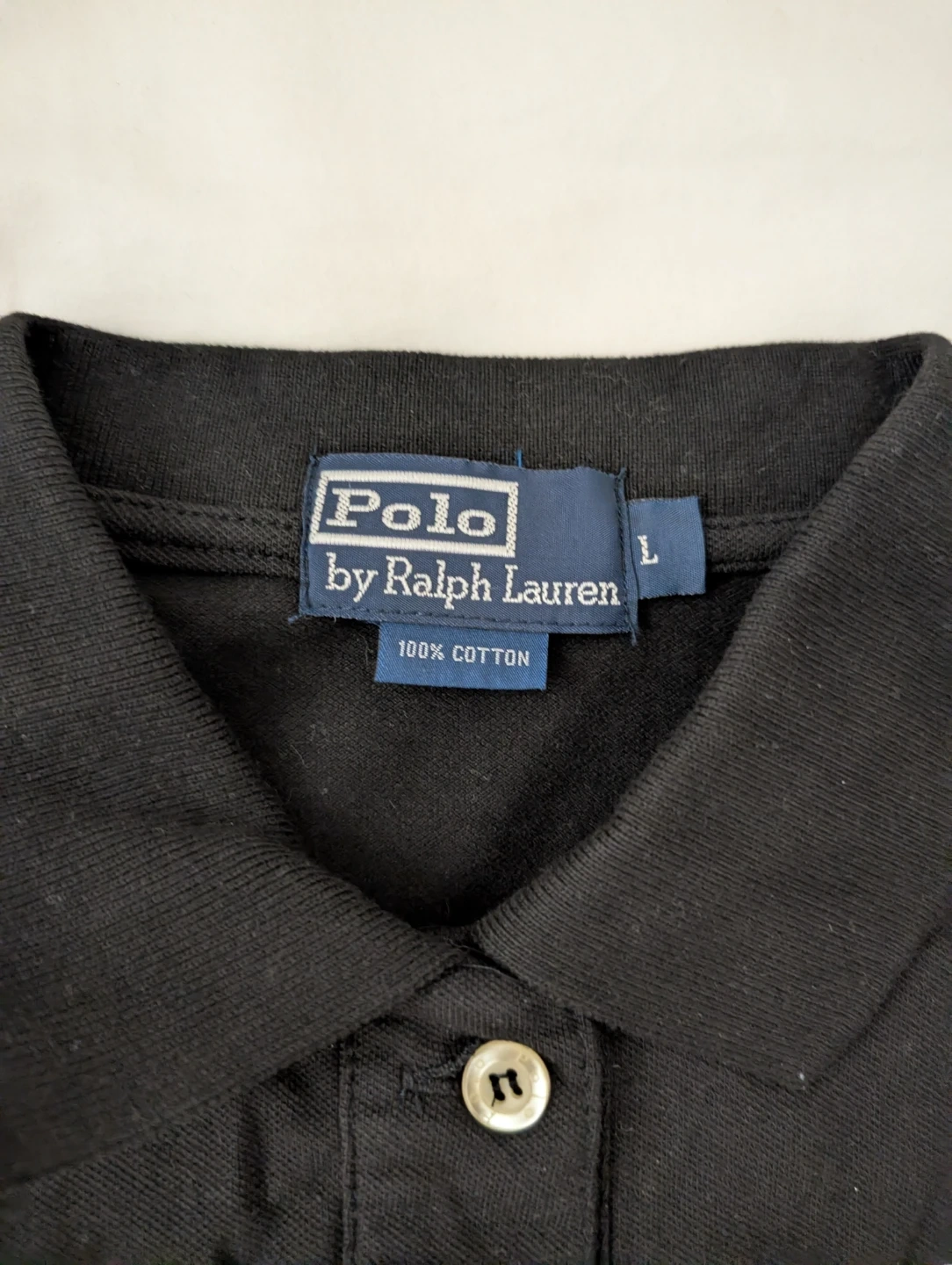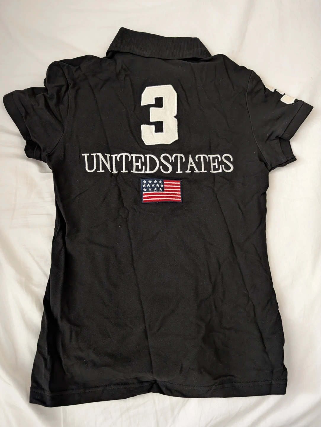 Black Polo Ralph Lauren short-sleeve polo shirt. Features a white "3" on the left sleeve and embroidered USA flag and "UNITED STATES" on the back. Made of 100% cotton.