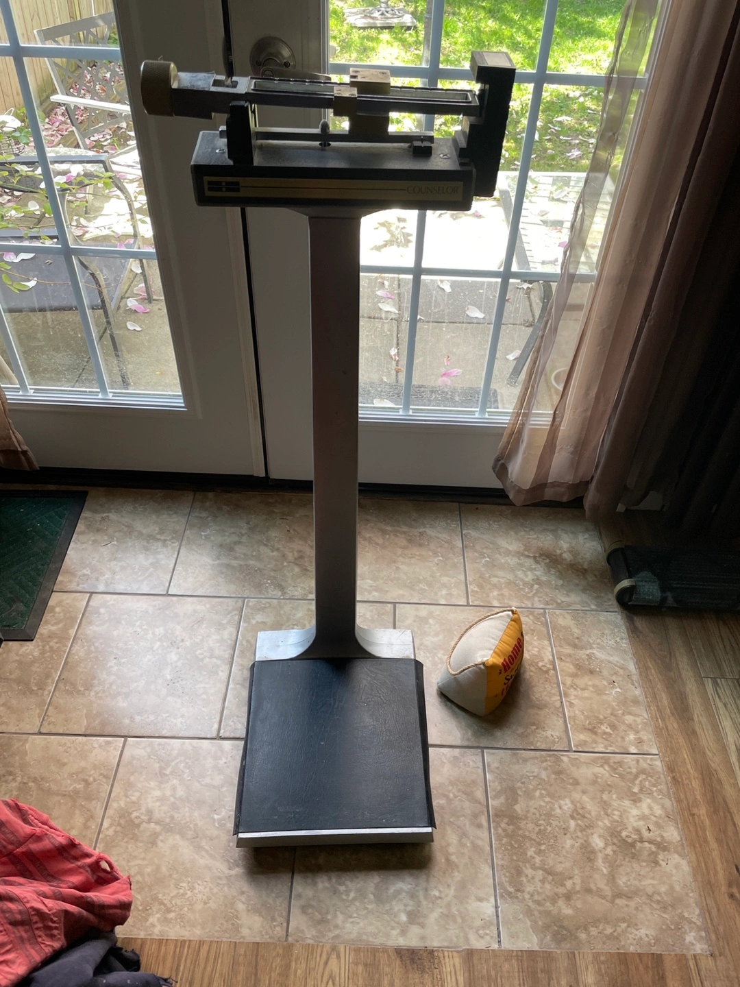 Vintage bathroom scale. Good condition. Mechanical. Works well. Tall and slender design. you can set the weights manually and it has a digital read out.