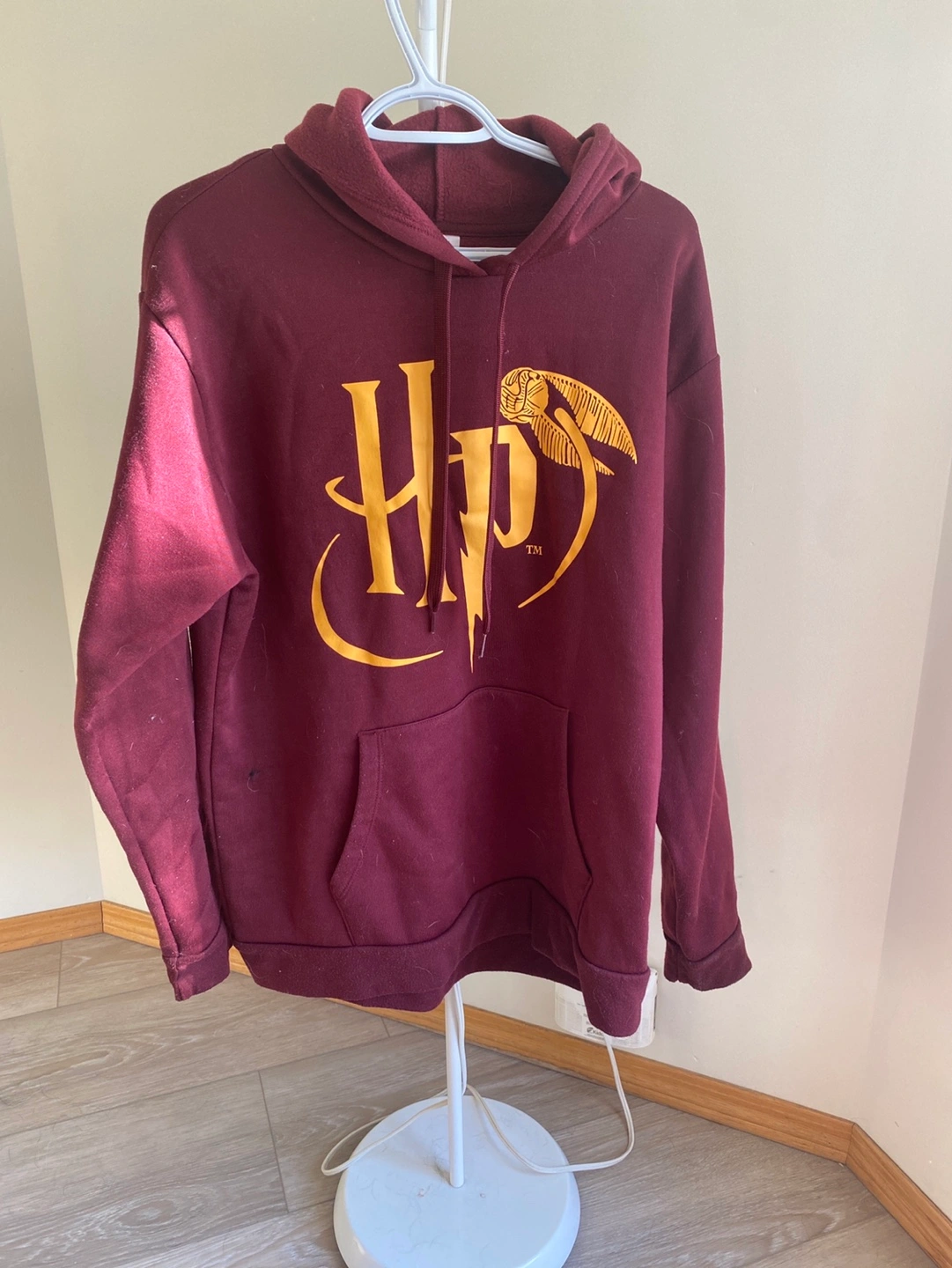 Maroon coloured hoodie featuring a gold Harry Potter logo. Long sleeves, kangaroo pocket. Great for casual wear.