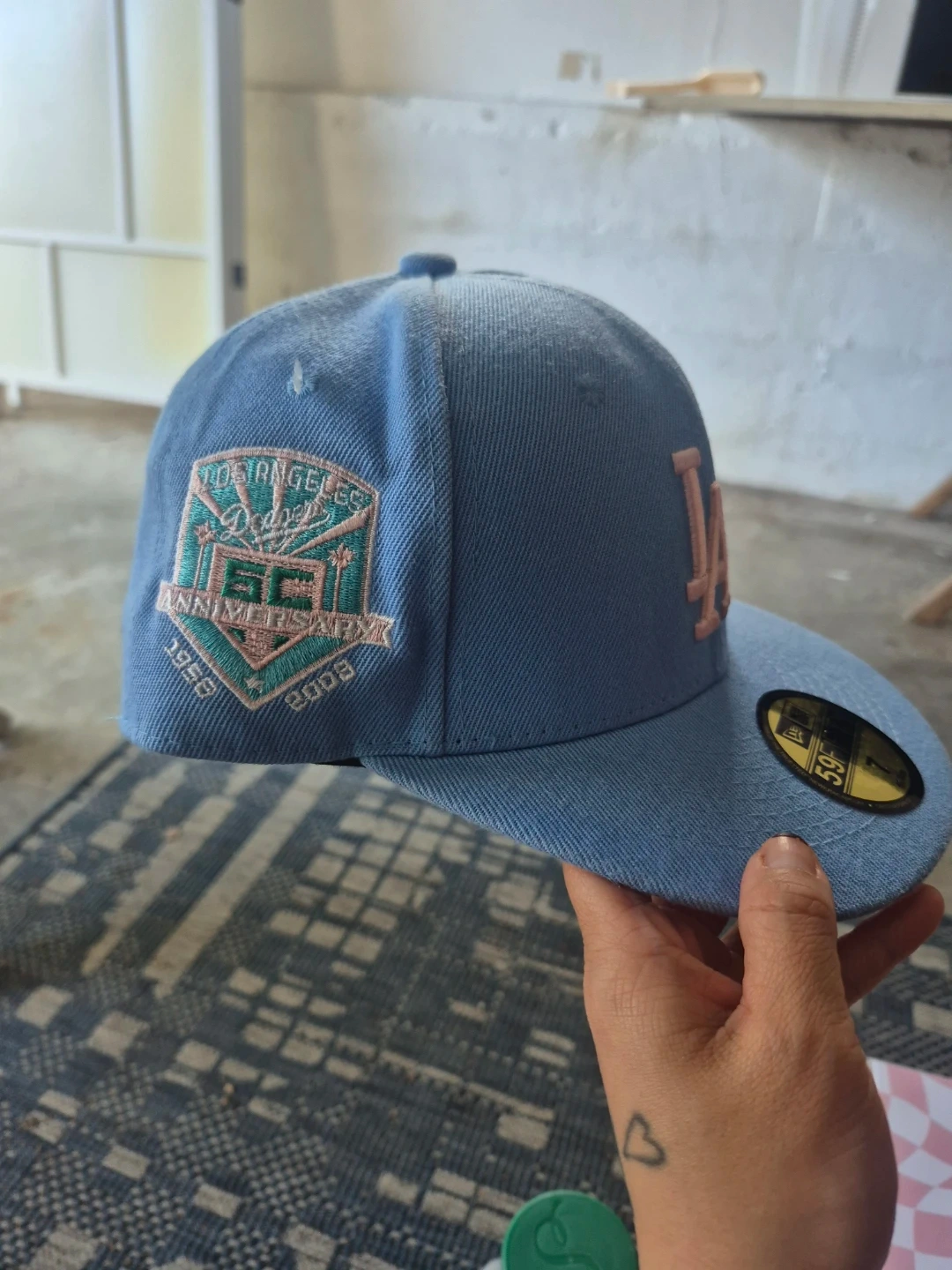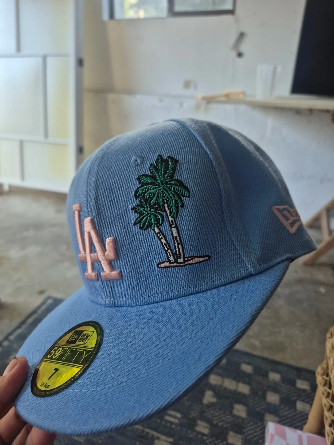 Sky blue New Era 59FIFTY hat featuring the LA Dodgers logo and palm trees. Includes a 50th anniversary patch on the side. Size is 7, measuring 55.8cm. The underside of the brim is a soft pink.