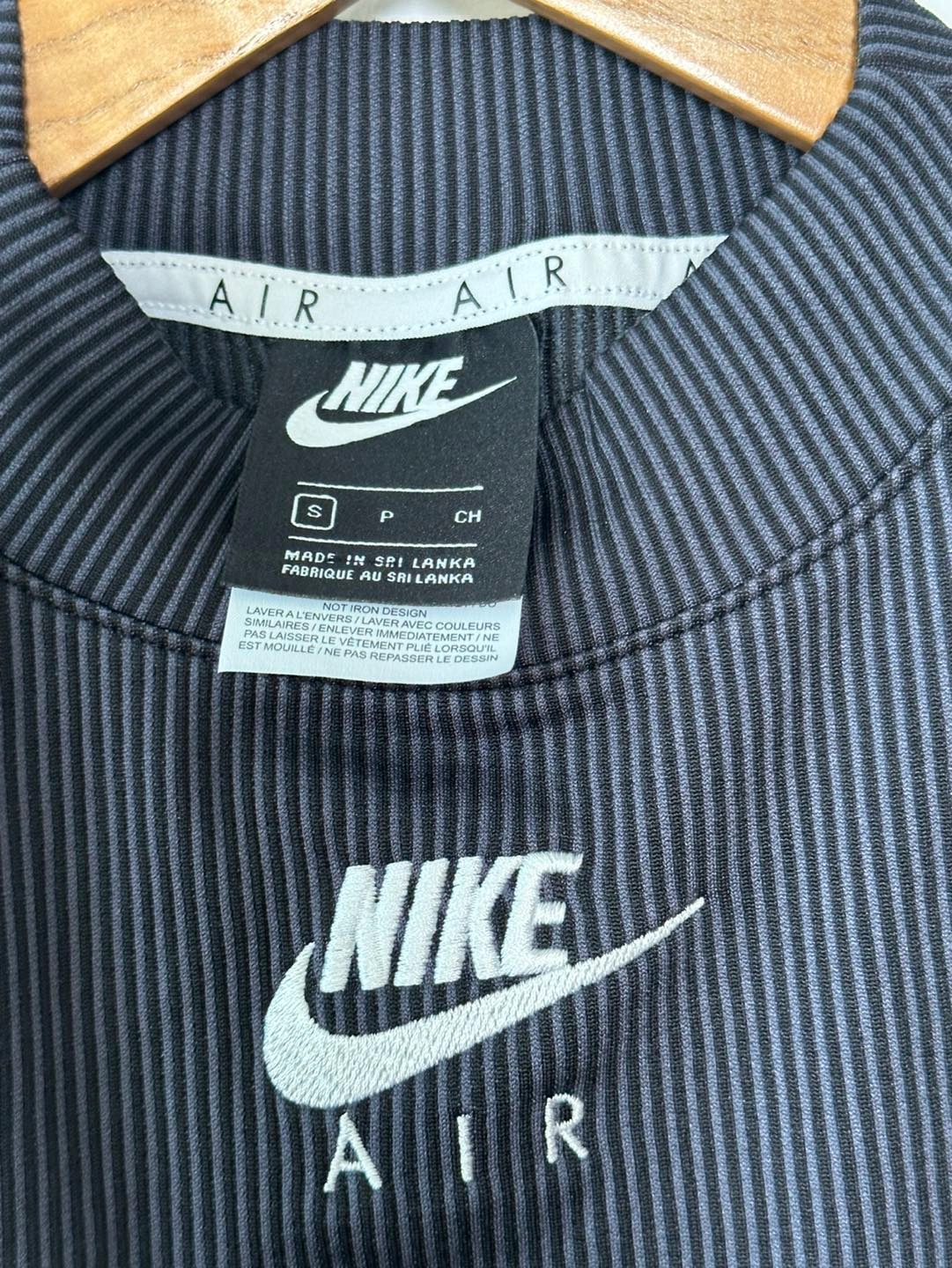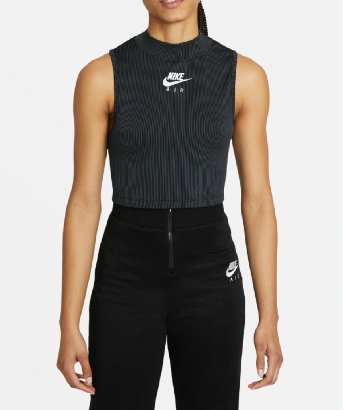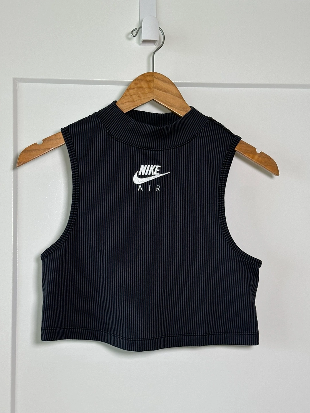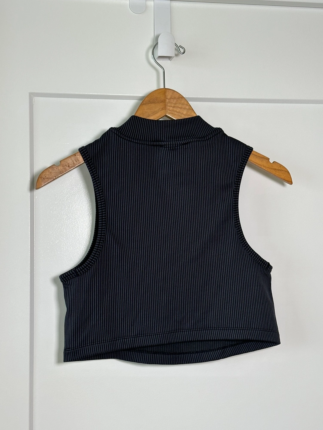 Worn once, like new. Sleeveless stretch rib knit nylon-blend jersey tank top in black and grey. Mock neck collar. Logo embroidered in white at chest. Cropped hem. Size: Small.