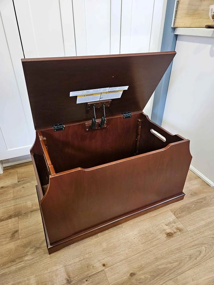 Solid wood toy chest with built-in side book storage, perfect for keeping toys, books, and clutter organized. Features: Large storage compartment with safety/soft-close lid. Built-in side book rack / organizer. Sturdy wood construction. Compact bench-style design. Dimensions: Width: 33”, Depth: 18”, Height: 18”. Condition: Good overall condition with some cosmetic wear from normal use. Surface wear on top. Minor corner damage on side (see photos). Fully functional and sturdy. Great for playroom, bedroom, or living space storage.