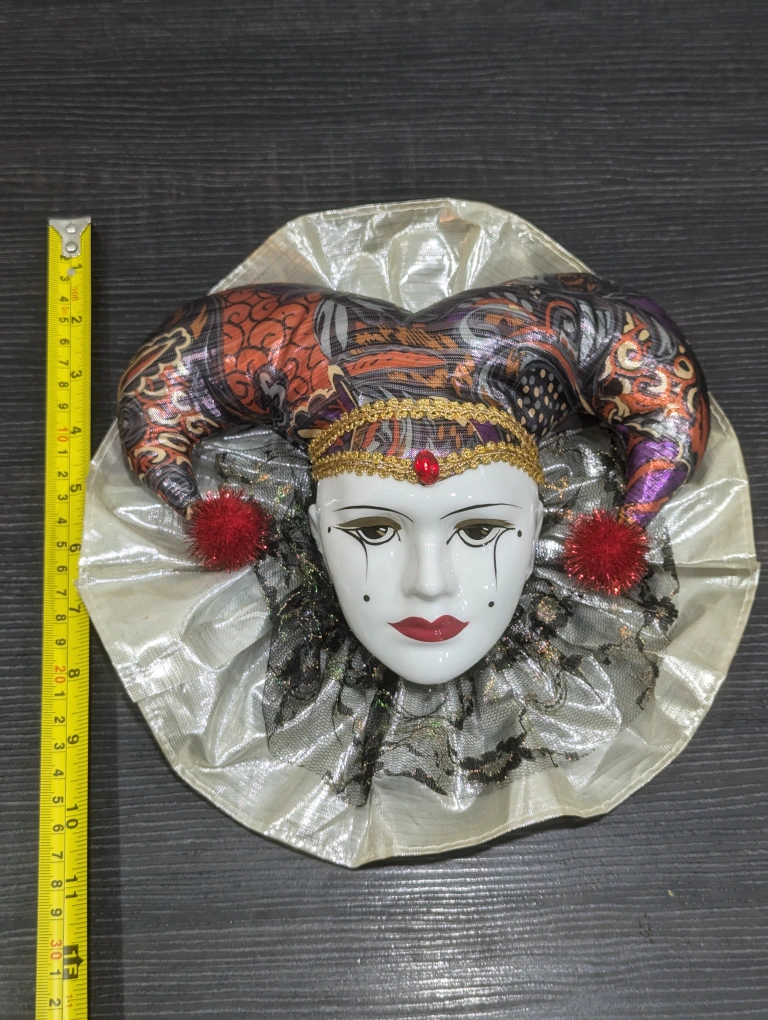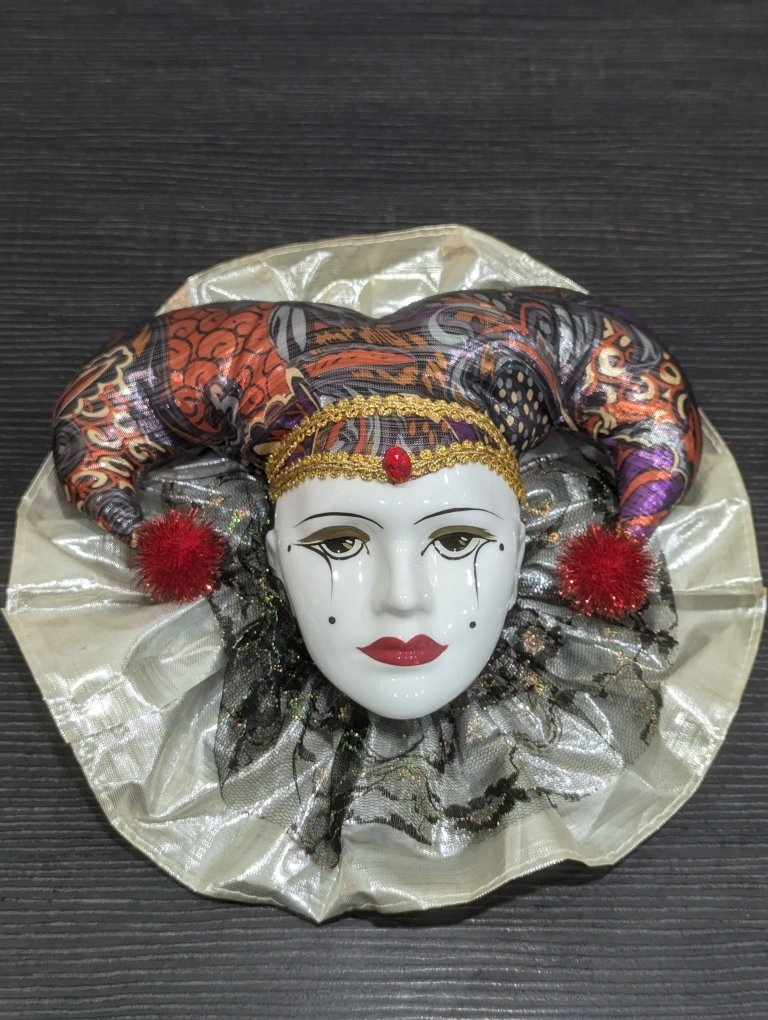 Vintage Venetian Harlequin Mask with Porcelain Face and Fabric-Stuffed Body for Wall Decor