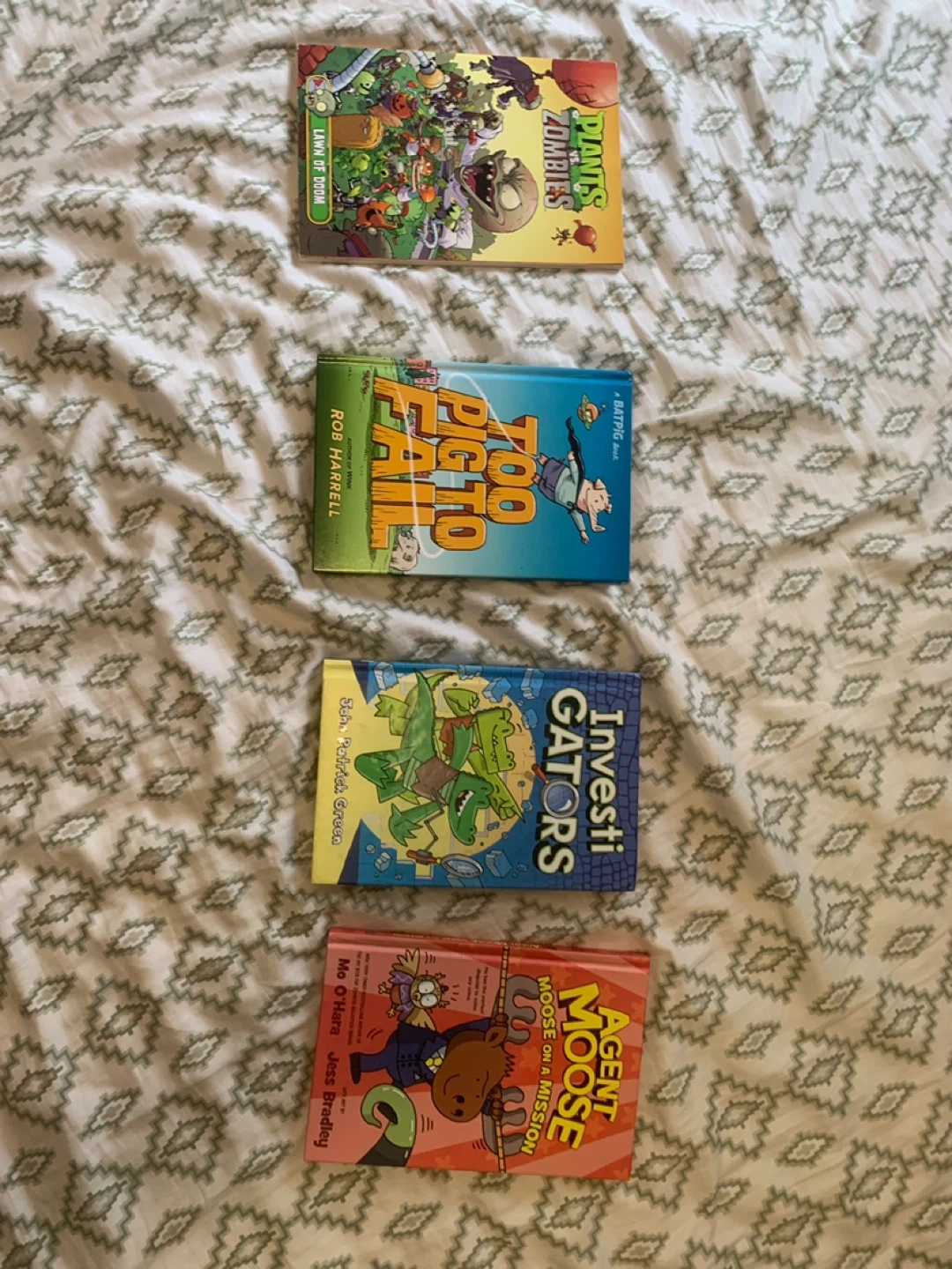 Bundle of four children's books including Plants vs. Zombies: Lawn of Doom, Too Pig To Fail, InvestiGators, and Agent Moose on a Mission.