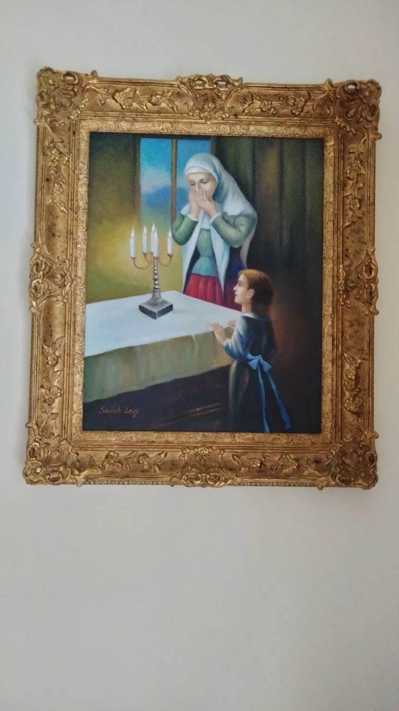 This painting, signed by the artist Sanch Levy, depicts an intimate indoor scene featuring two figures in what appears to be a moment of prayer or solemn reflection.