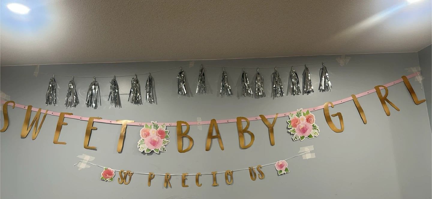 Celebrate your little one with this "Sweet Baby Girl" banner. It features gold lettering and decorative floral accents. Includes a "So Precious" banner to complete the festive look. Perfect for baby showers and nursery decorations!