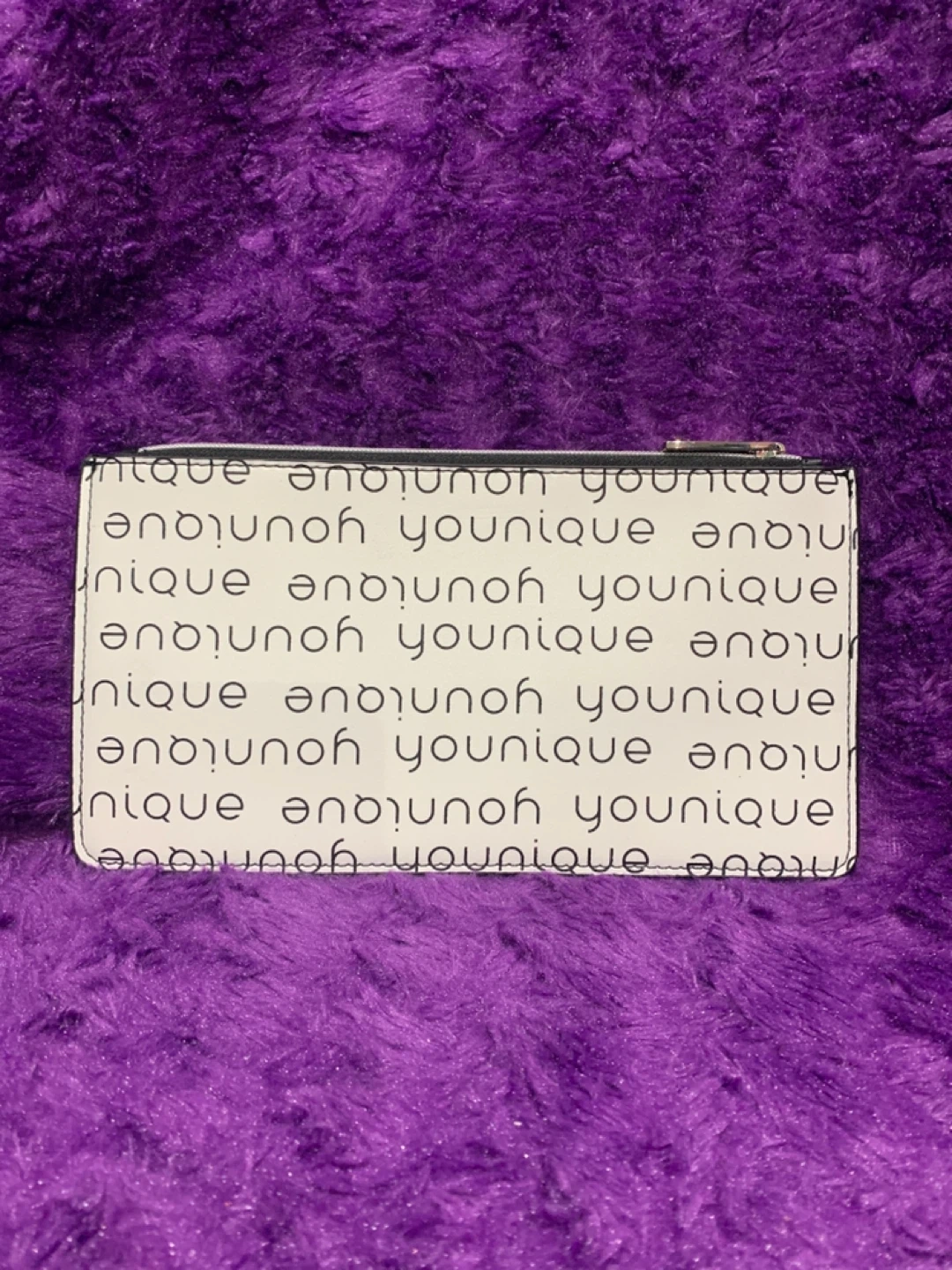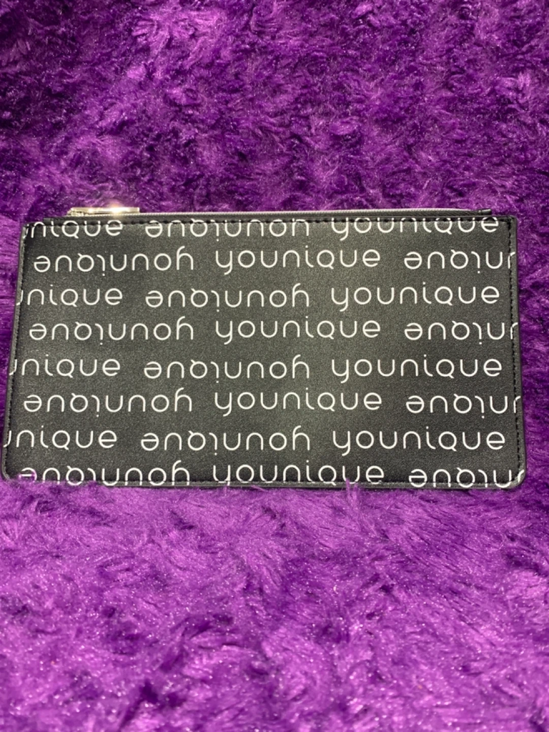 This Younique cosmetic pouch has a black background with the Younique logo repeated all over. It's great for storing makeup or other small personal items. Zipper closure.