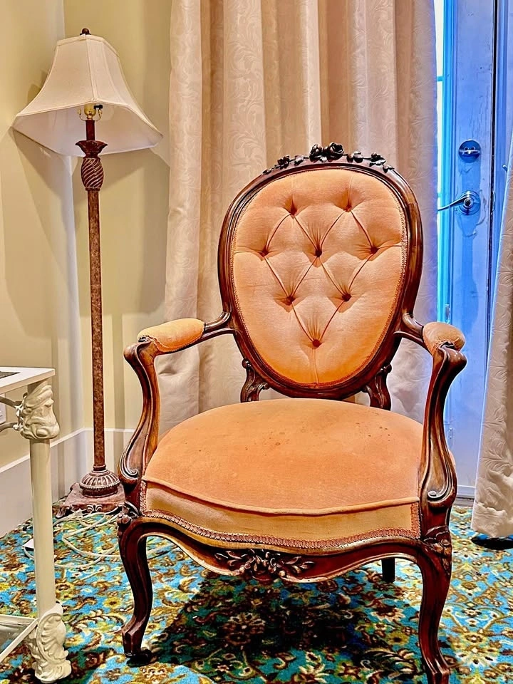 This stately armchair features an intricately carved wooden frame with floral cresting and graceful cabriole legs. Its plush, tufted velvet upholstery brings a warm, elegant presence, making it a standout piece in any traditional or antique-inspired setting. Dimensions: 61cm*64cm*108cm. Moving sale - vintage Scandinavian furniture (1970s-1990s). All in great condition, timeless and stylish. Perfect for vintage lovers or anyone decorating with character. Measurements are approximate and may have slight differences.