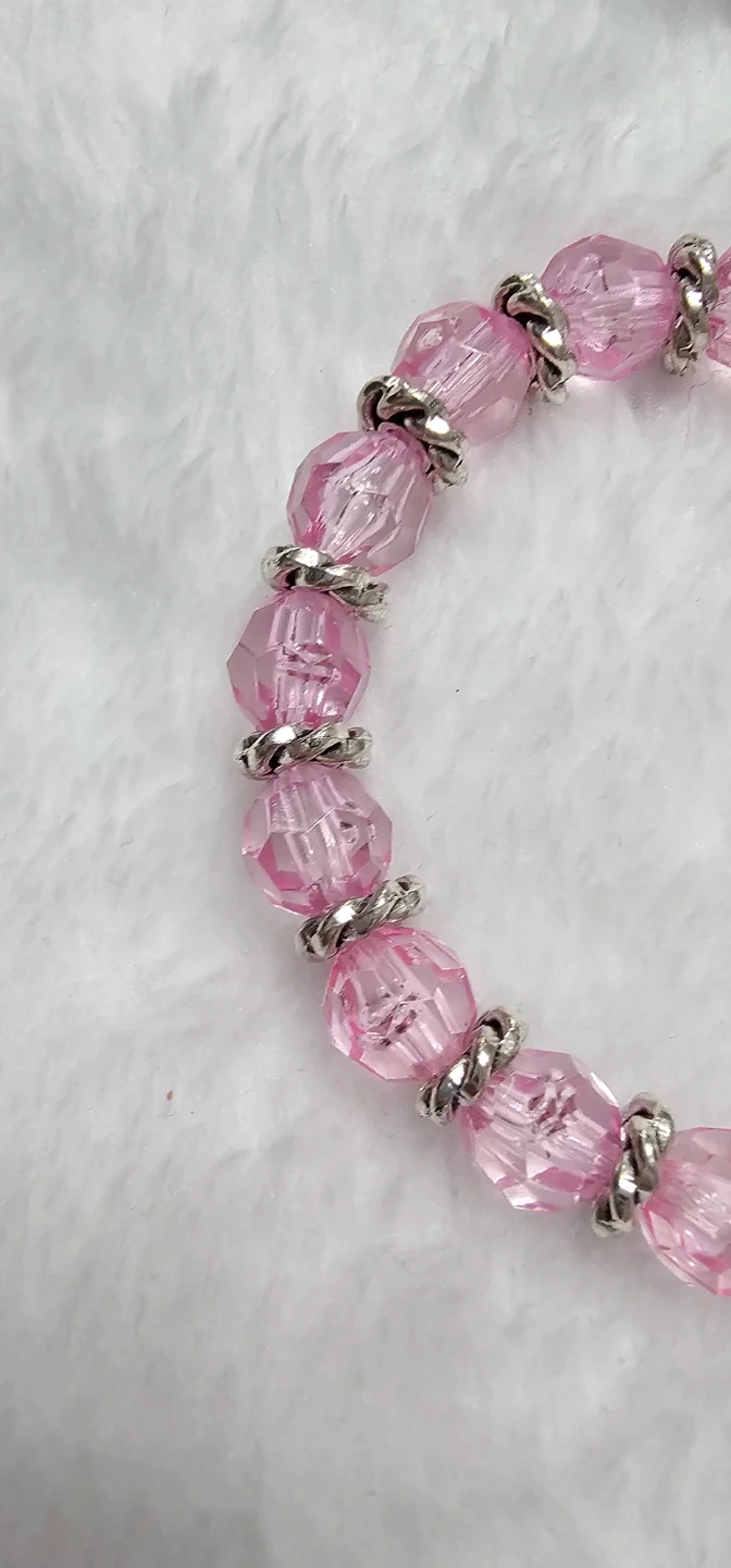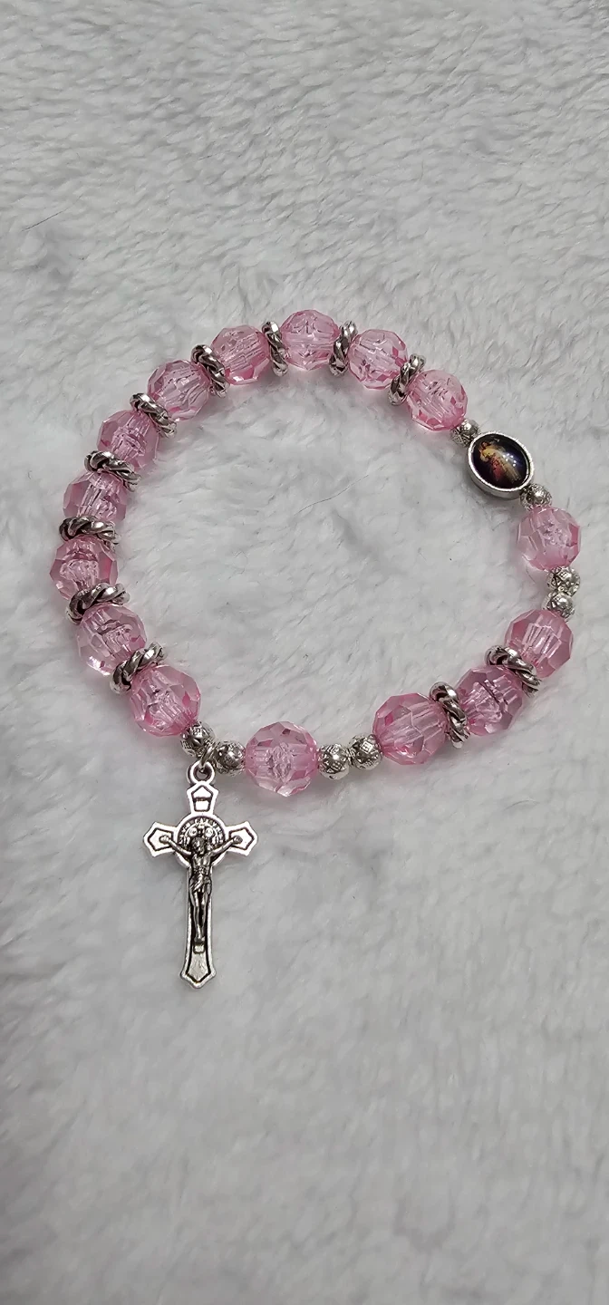 A pretty pink beaded rosary bracelet for daily prayer. It features faceted glass beads and a silver-tone crucifix charm. This bracelet is elastic for a easy put on. It's a lovely piece for personal devotion.