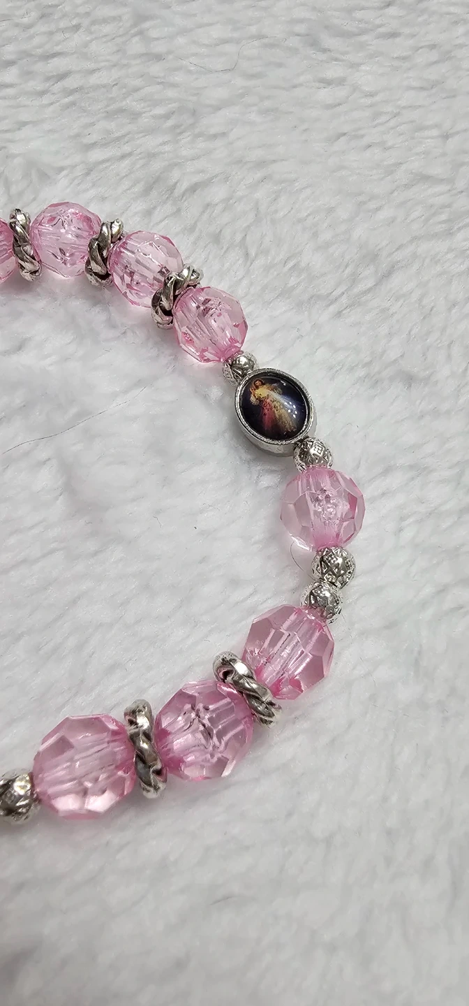 A pretty pink beaded rosary bracelet for daily prayer. It features faceted glass beads and a silver-tone crucifix charm. This bracelet is elastic for a easy put on. It's a lovely piece for personal devotion.