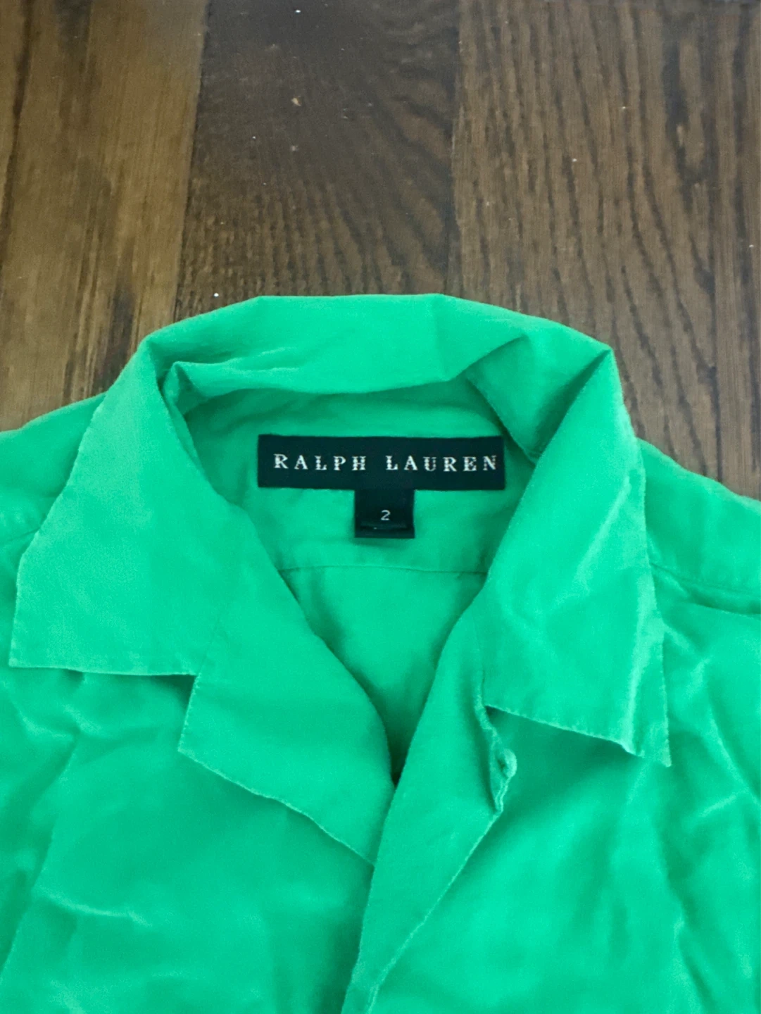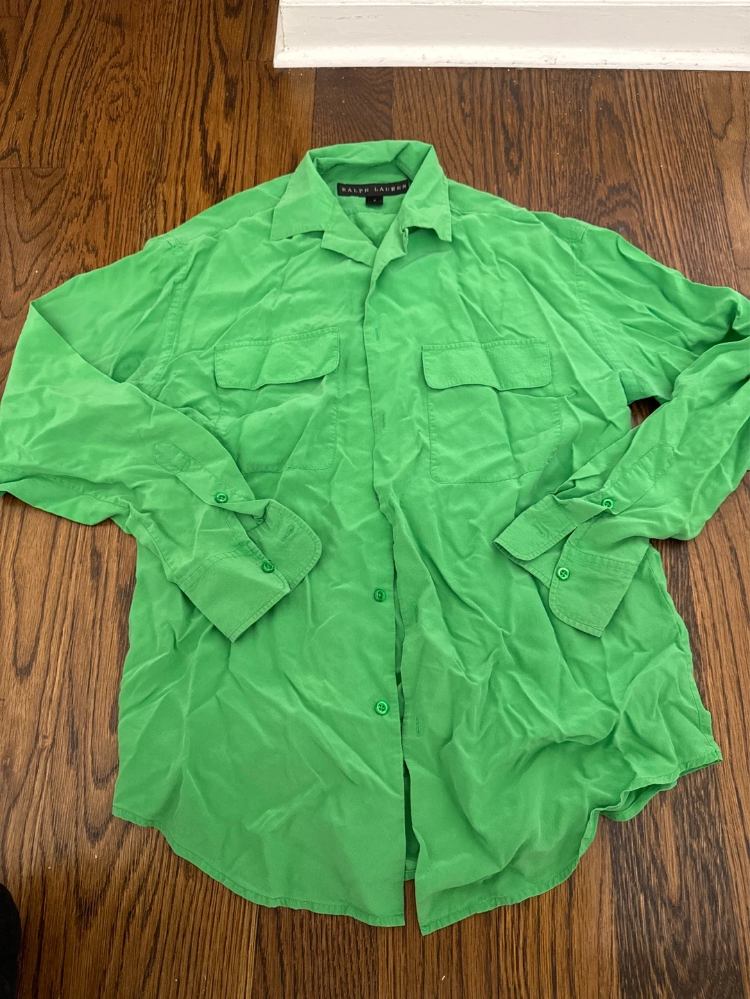 Buy & SellRalph Lauren Green Silk Button Down Shirt Size 2Ralph Lauren Green Silk Button Down Shirt Size 2$35This is a vibrant green Ralph Lauren button-down shirt. It's made from 100% silk and features two front pockets. Dry clean only.ConditionGoodSize2BrandRalph LaurenWHERE TO MEET138 spring streetView MapSELLERverifiedAnnaSoHo1416 reviews0 chats·0 favorites·2 viewsSEND CHAT TO SELLERHi Anna! I’m interested in your listing.Hi Anna! I’m interested in your listing.Get the Karrot app to chatSign In to chat