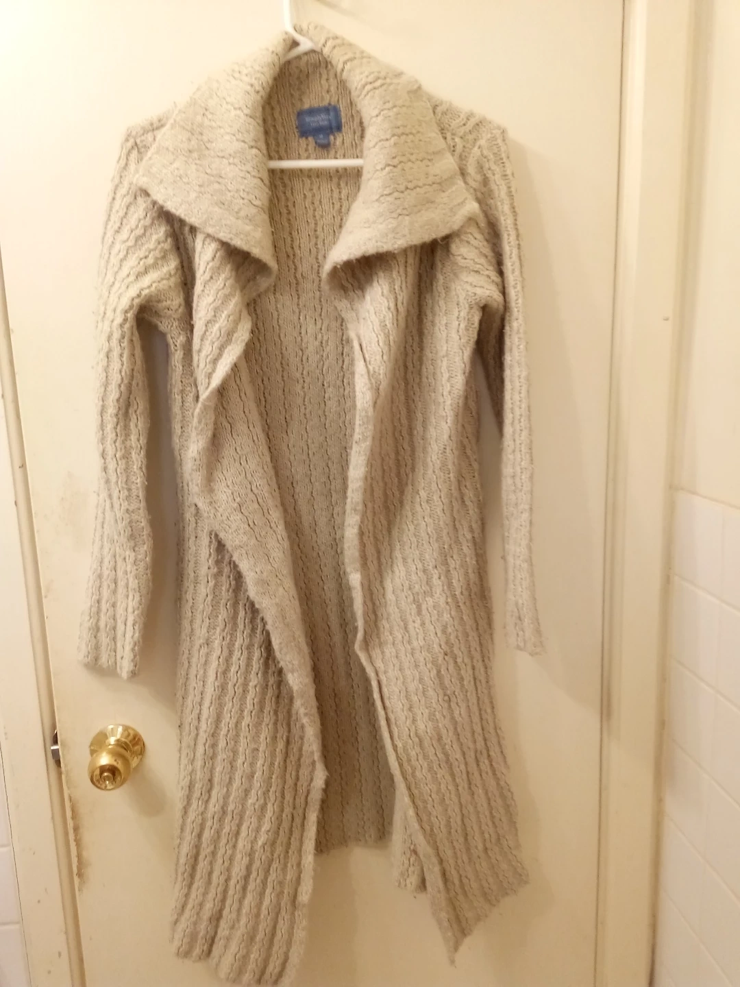 Vera Wang beige knit long cardigan. Open front design. It's made of a textured knit material. Perfect for layering during cooler weather!
