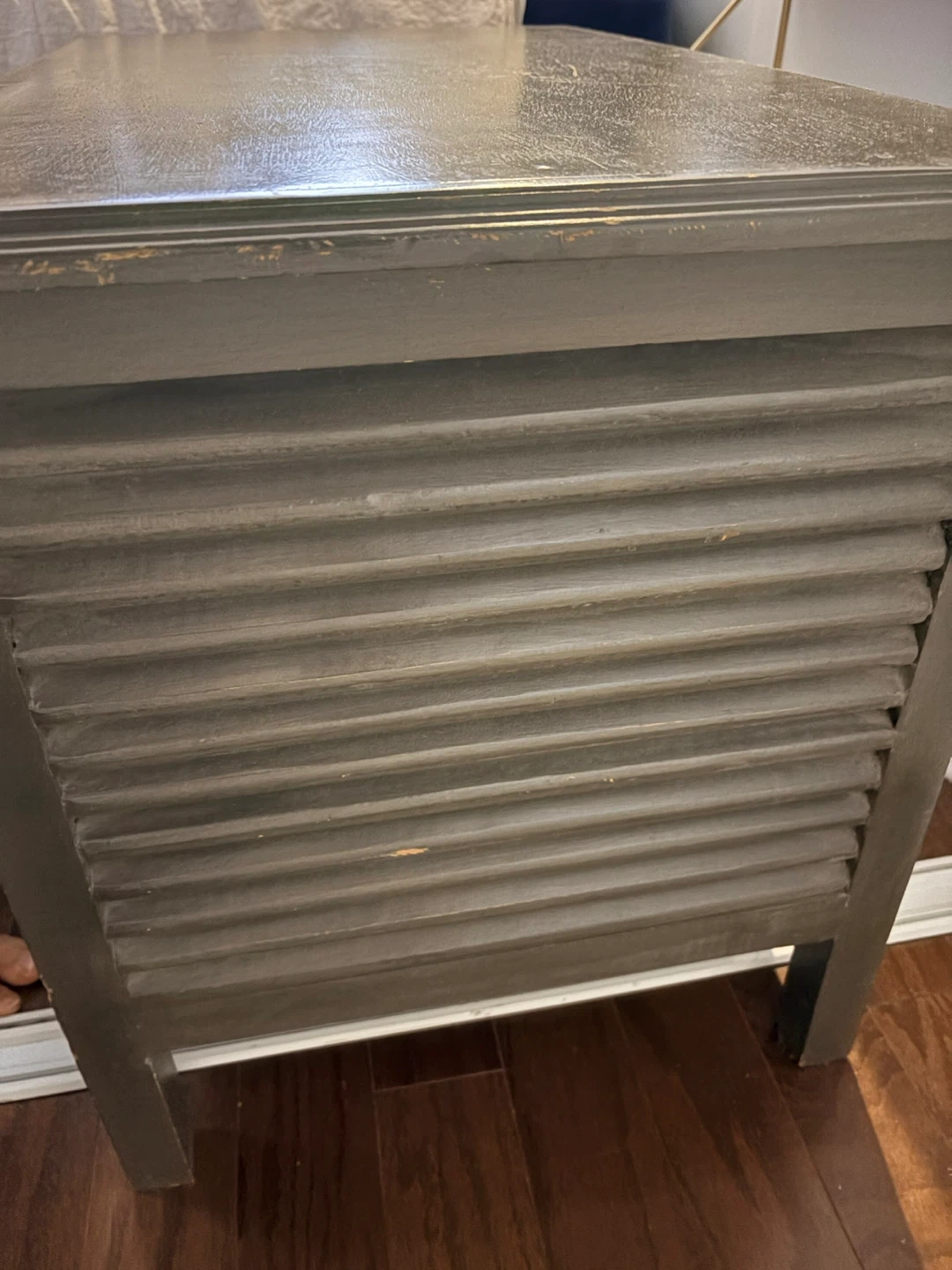 Beautiful and sturdy dark grey/black wooden storage chest featuring classic louvered drawer fronts and decorative ring pulls. This versatile piece works perfectly as a large bedside nightstand, an entryway catch-all, or extra storage in a living area.