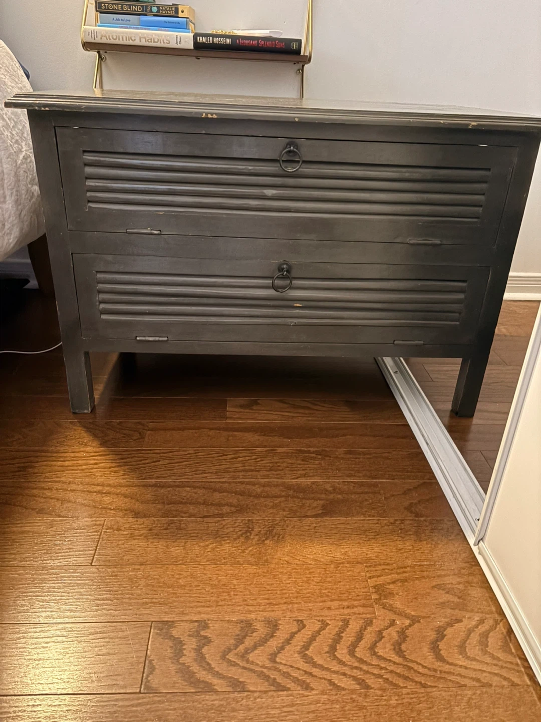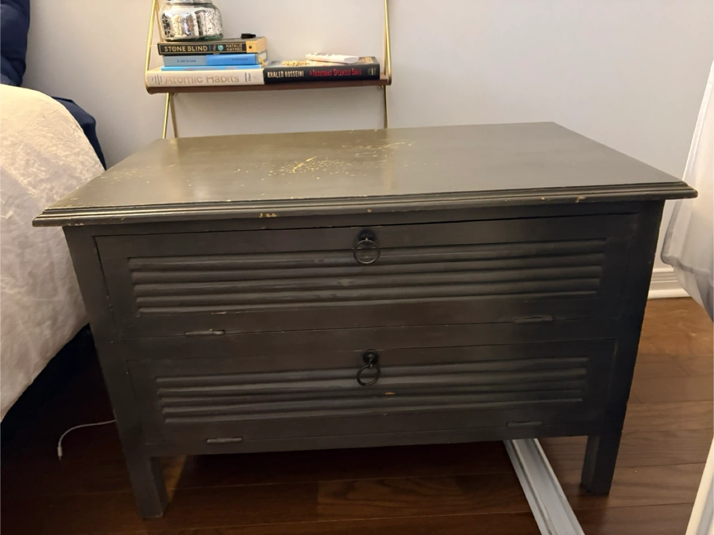 Beautiful and sturdy dark grey/black wooden storage chest featuring classic louvered drawer fronts and decorative ring pulls. This versatile piece works perfectly as a large bedside nightstand, an entryway catch-all, or extra storage in a living area.