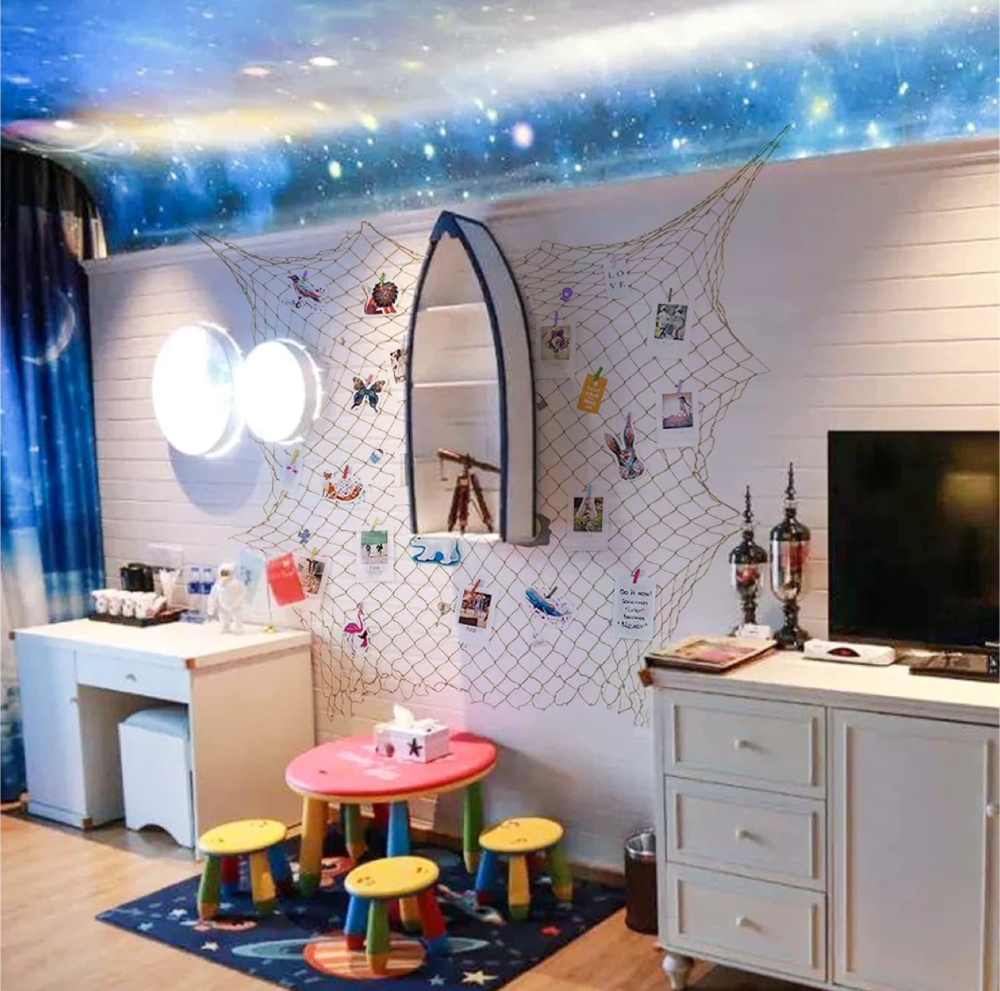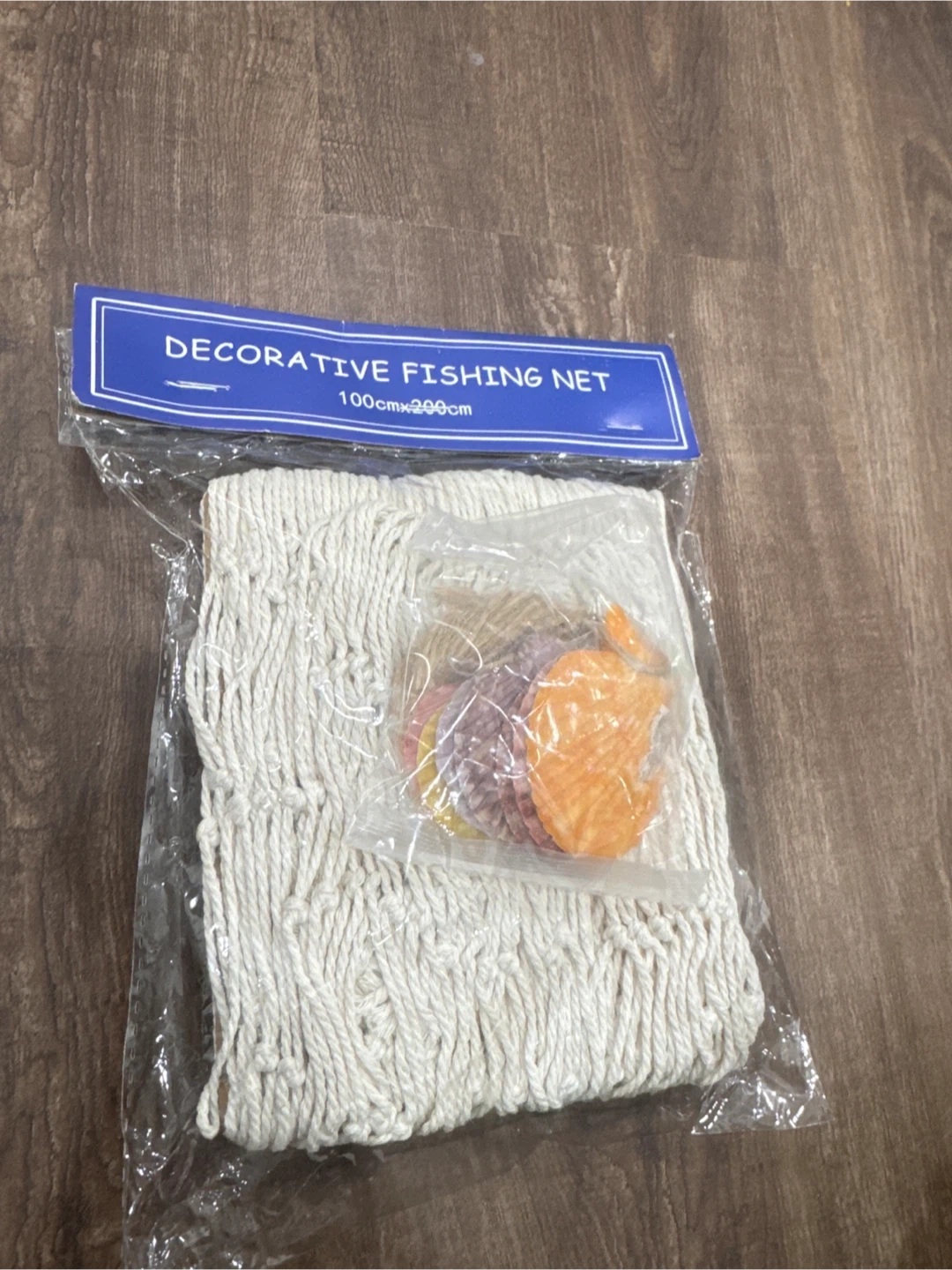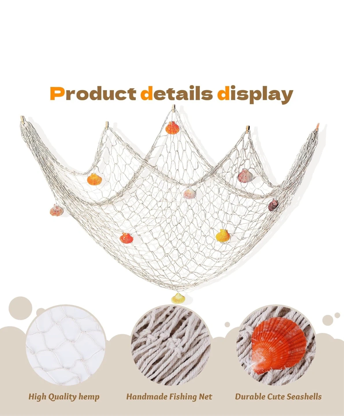 This decorative fishing net measures 100cm x 200cm. It's made from high-quality hemp and adorned with handmade, durable seashells. It adds a lovely nautical touch to any space!