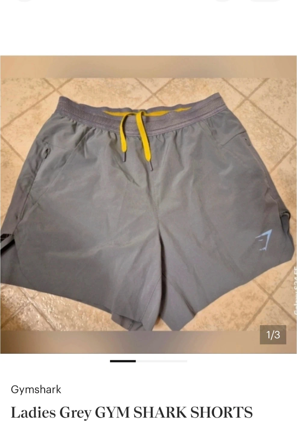 These are grey Gymshark ladies' running shorts. They've got a comfortable elastic waistband with a yellow drawstring. There's also a small zip pocket on the side.