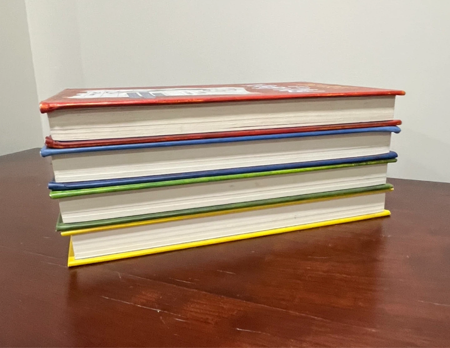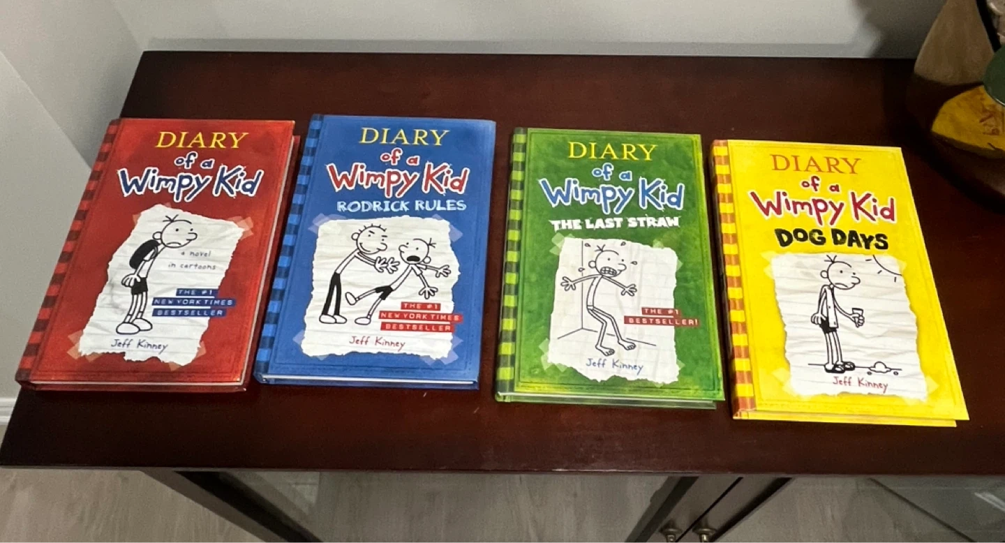 This is a collection of four Diary of a Wimpy Kid books by Jeff Kinney. Titles include the first book, Rodrick Rules, The Last Straw, and Dog Days. Great for young readers who enjoy humour and relatable characters. Never read.