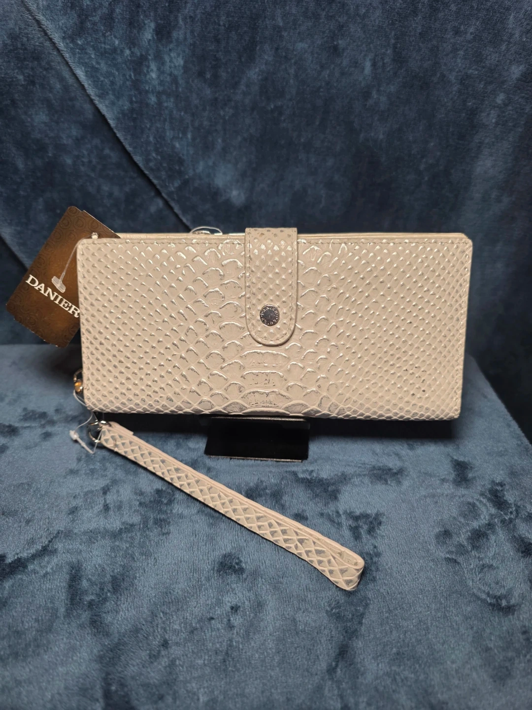 Selling a Danier wallet in a beige snakeskin pattern.GENUINE LEATHER . It's in great condition and has lots of slots for cards and cash. Perfect for keeping your essentials organized!