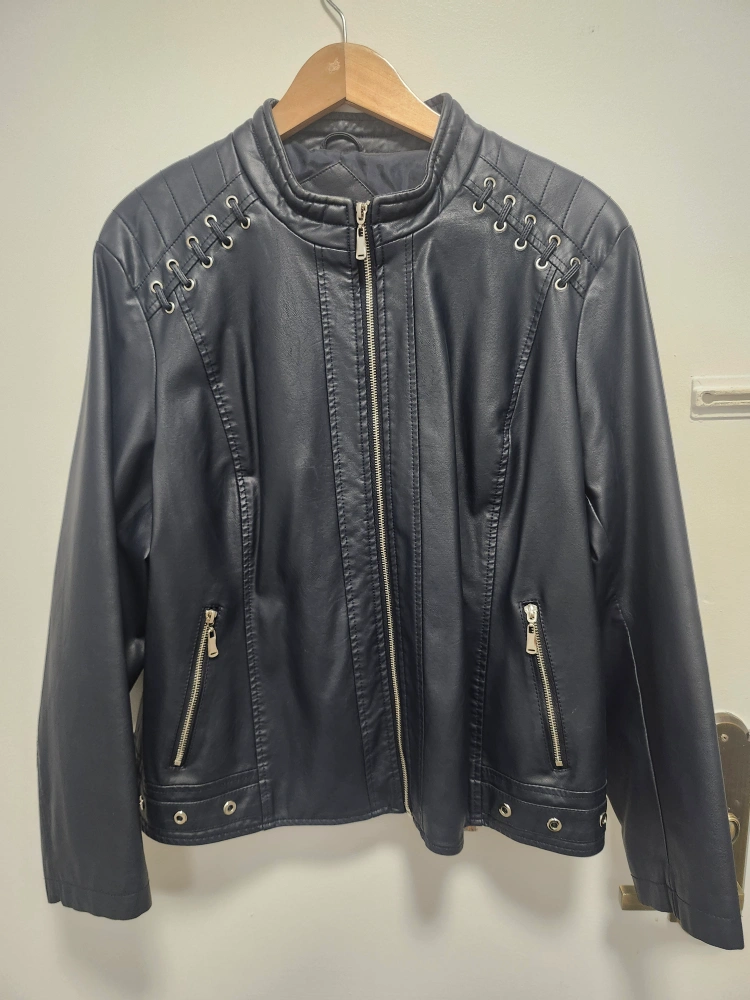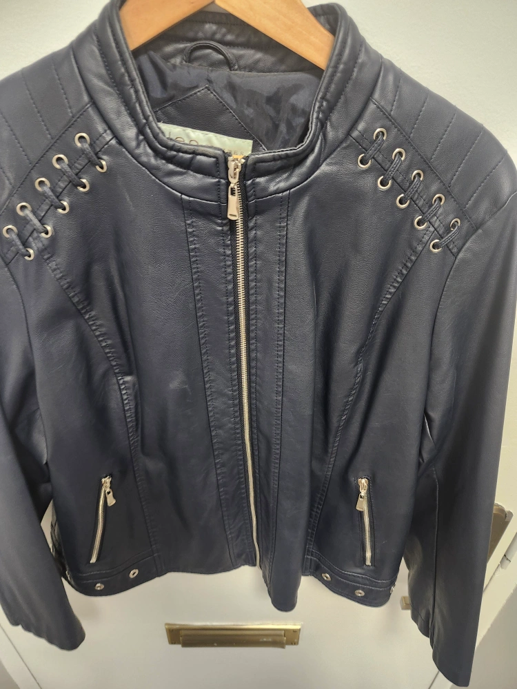 Selling a navy blue faux leather jacket with zipper closure and stylish detailing on the shoulders. Zippered pockets