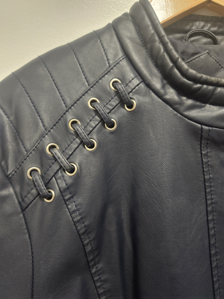Selling a navy blue faux leather jacket with zipper closure and stylish detailing on the shoulders. Zippered pockets