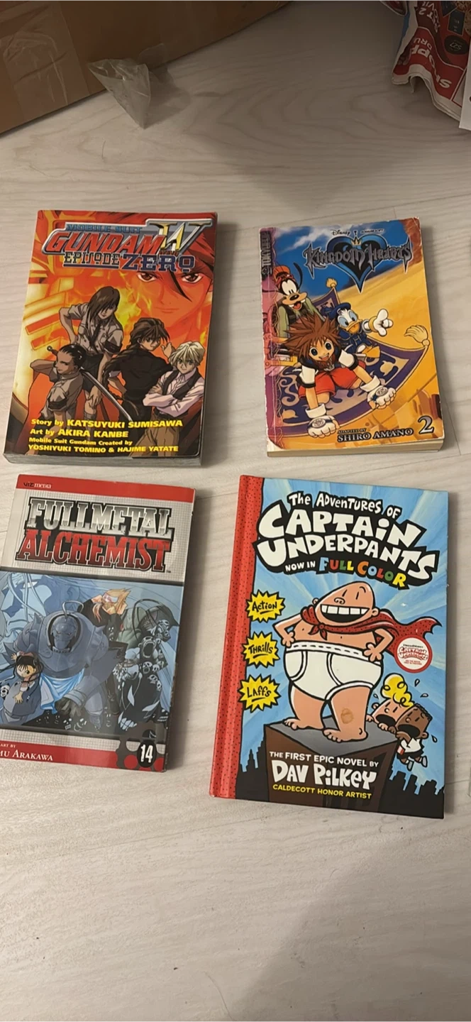 This lot includes popular series like Gundam, Fullmetal Alchemist, Kingdom Hearts, Naruto, Yu-Gi-Oh!, and Haikyuu!! It also features a Captain Underpants book. Perfect for any fan of anime and graphic novels! 5$ each 35 for all OBO