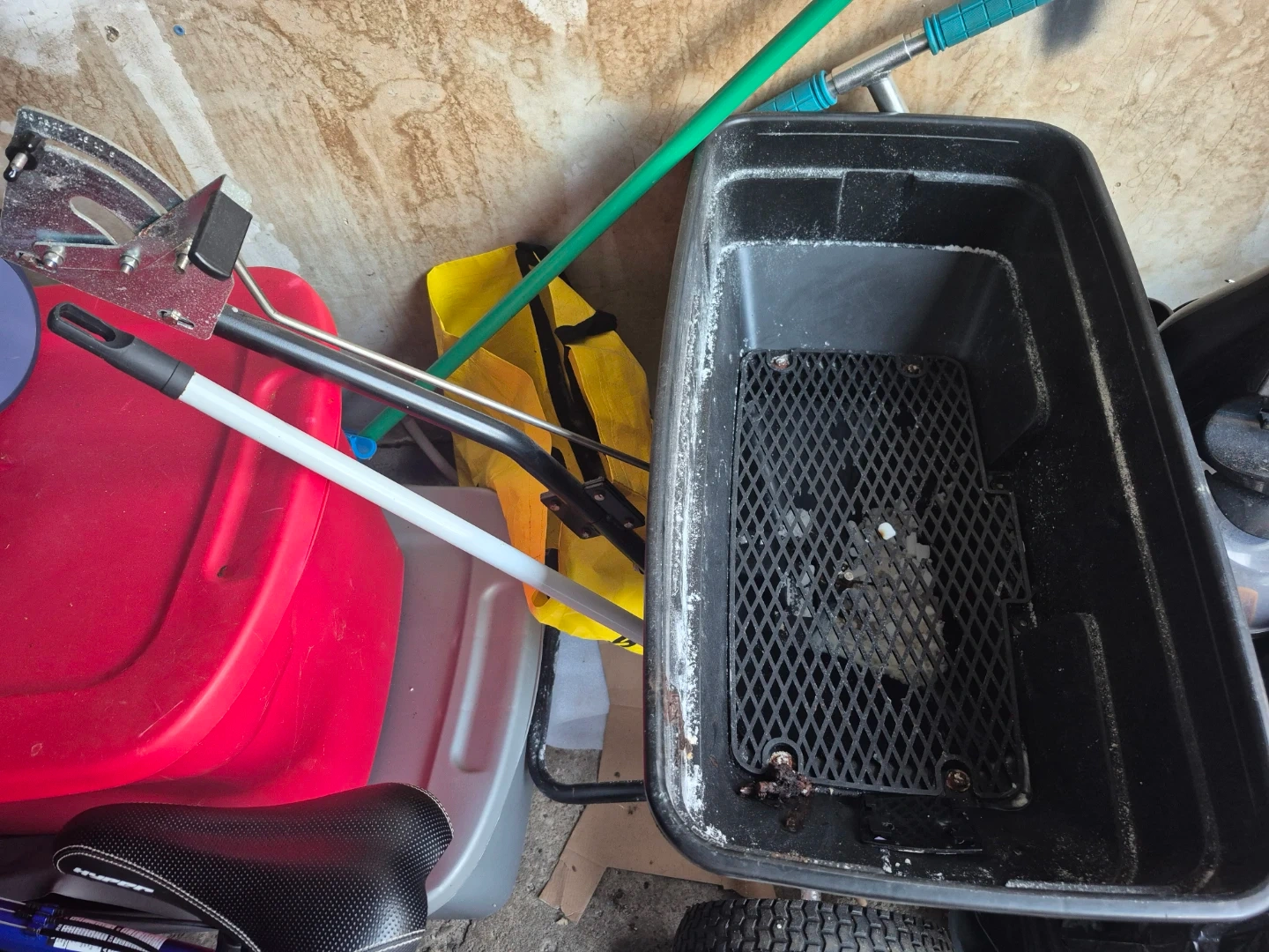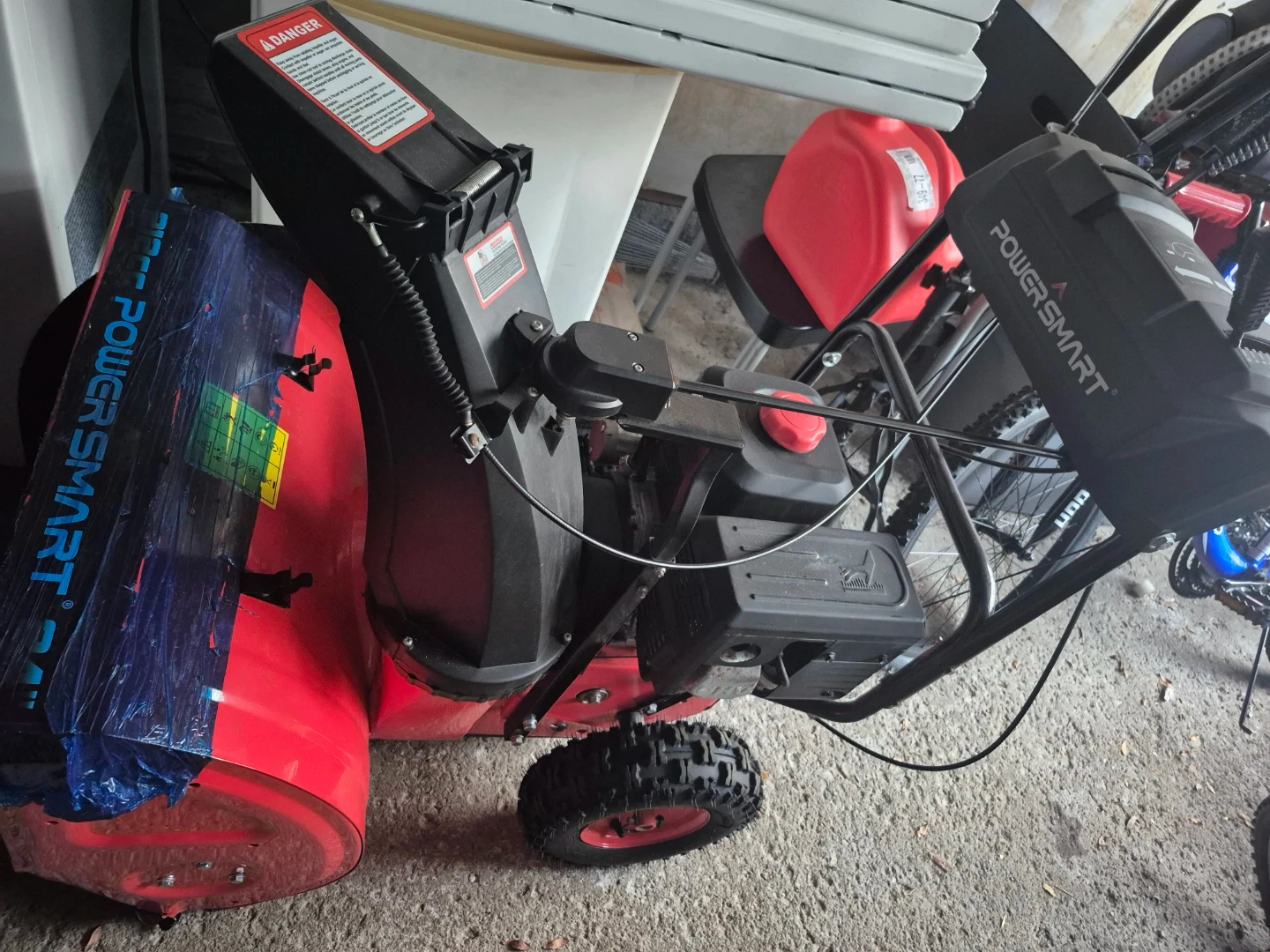 PowerSmart snow blower for clearing driveways and walkways. It's a gas-powered unit designed for winter snow removal. Includes the original box for transport or storage.