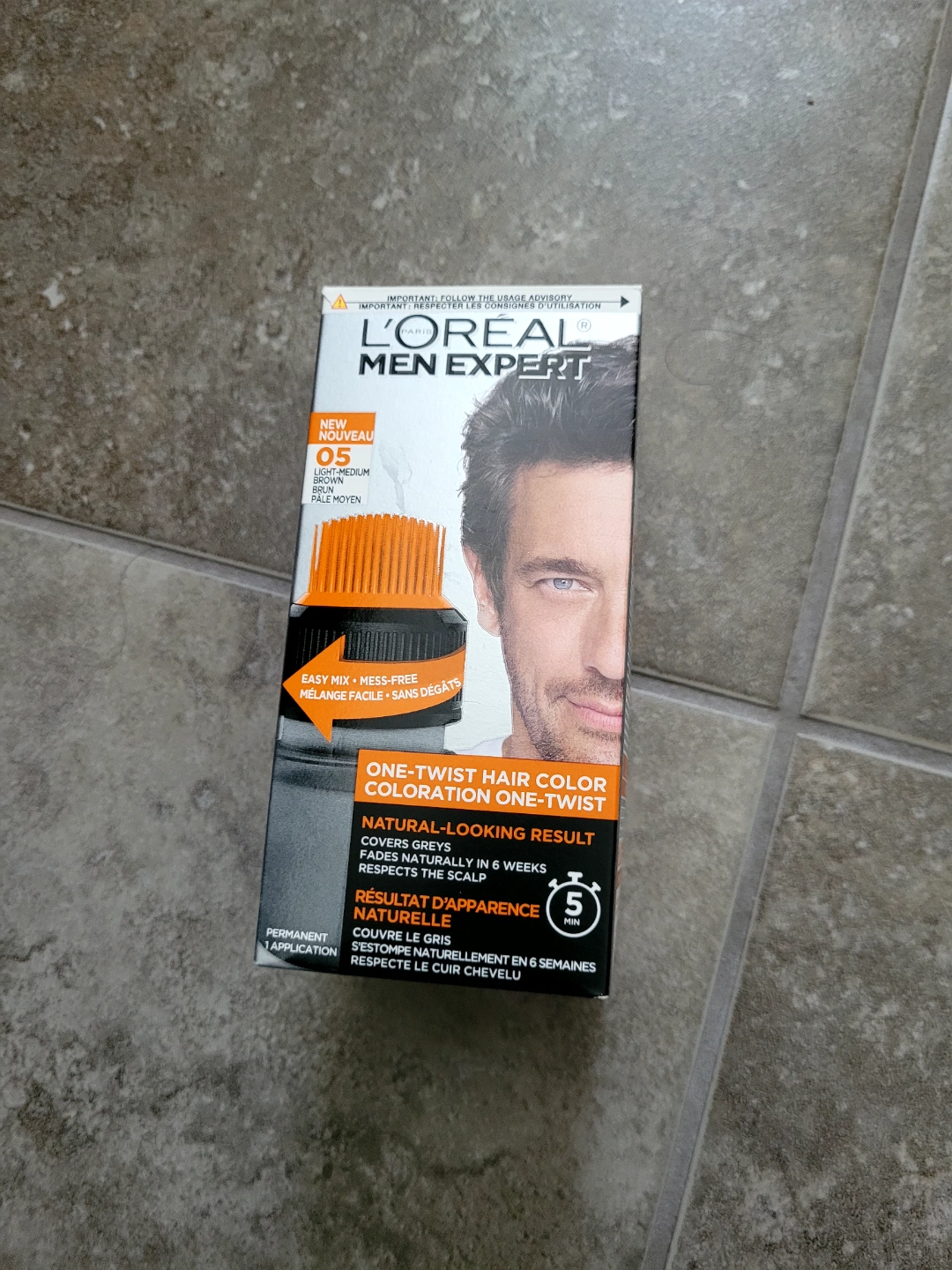 New L'Oréal Men Expert One-Twist hair colour. Shade 05 Light Medium Brown. Easy mix, mess-free application. Natural-looking results. Covers grey. Fades naturally in 6 weeks. Permanent hair colour.