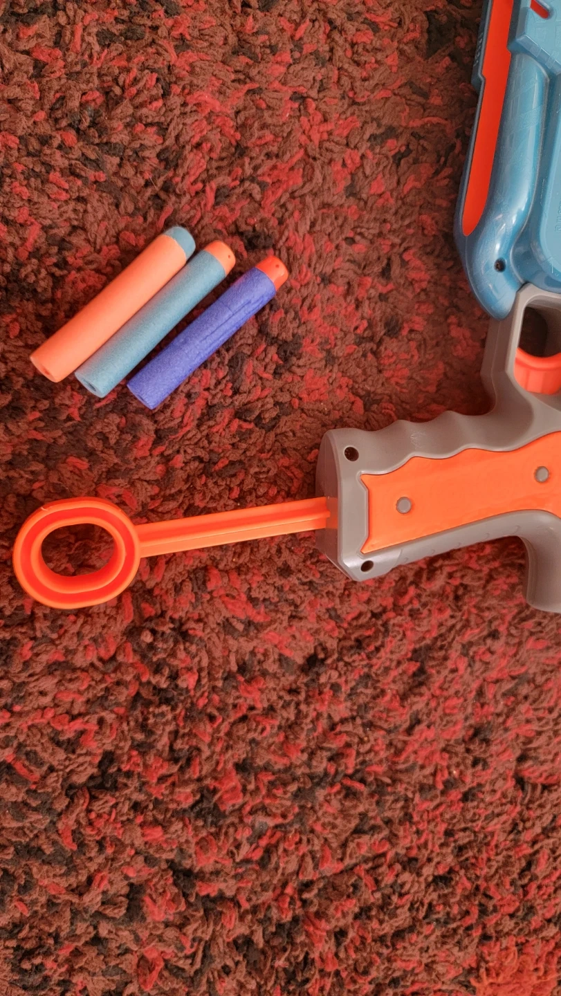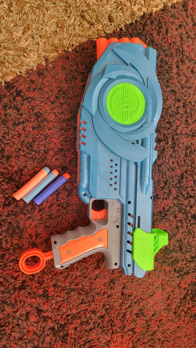 This is a Nerf Elite Alpha Strike blaster. It's blue and orange with green accents. Comes with three foam darts.